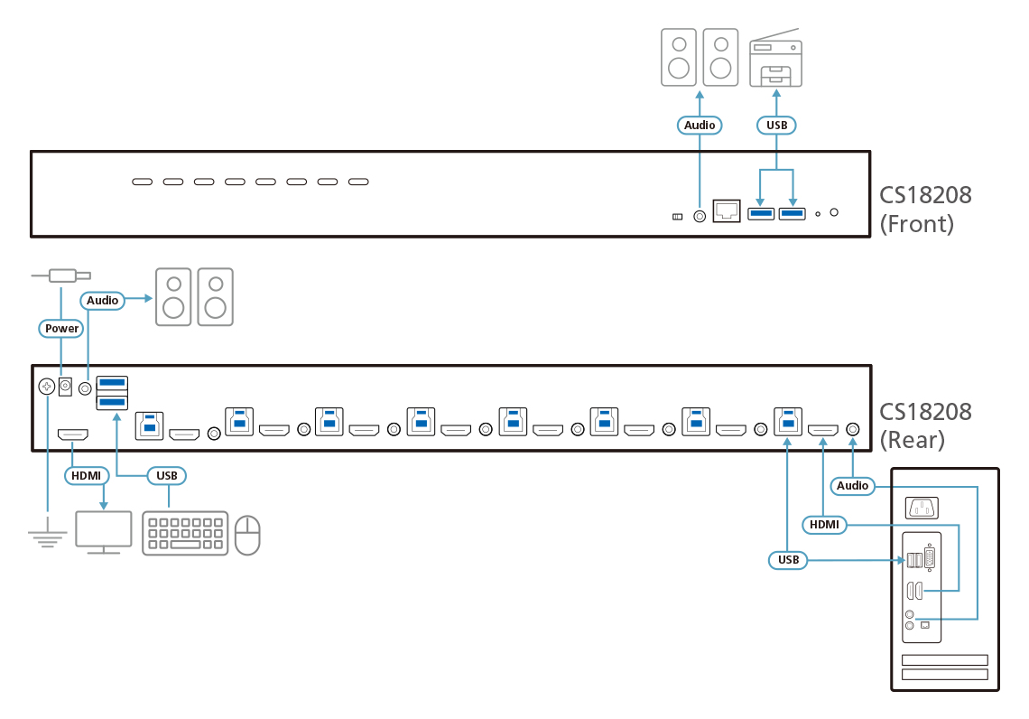 Besides, the CS18208 comes with a built-in USB 3.1 Gen 1 hub delivering data transfer rates up to 5 Gbps, allowing users to speed up operations and share USB peripherals instantly. For user-friendly port selection methods, the CS18208 offers pushbuttons, hotkeys, RS-232 commands, and OSD with newly-designed UI, bringing effortless and intuitive operations.