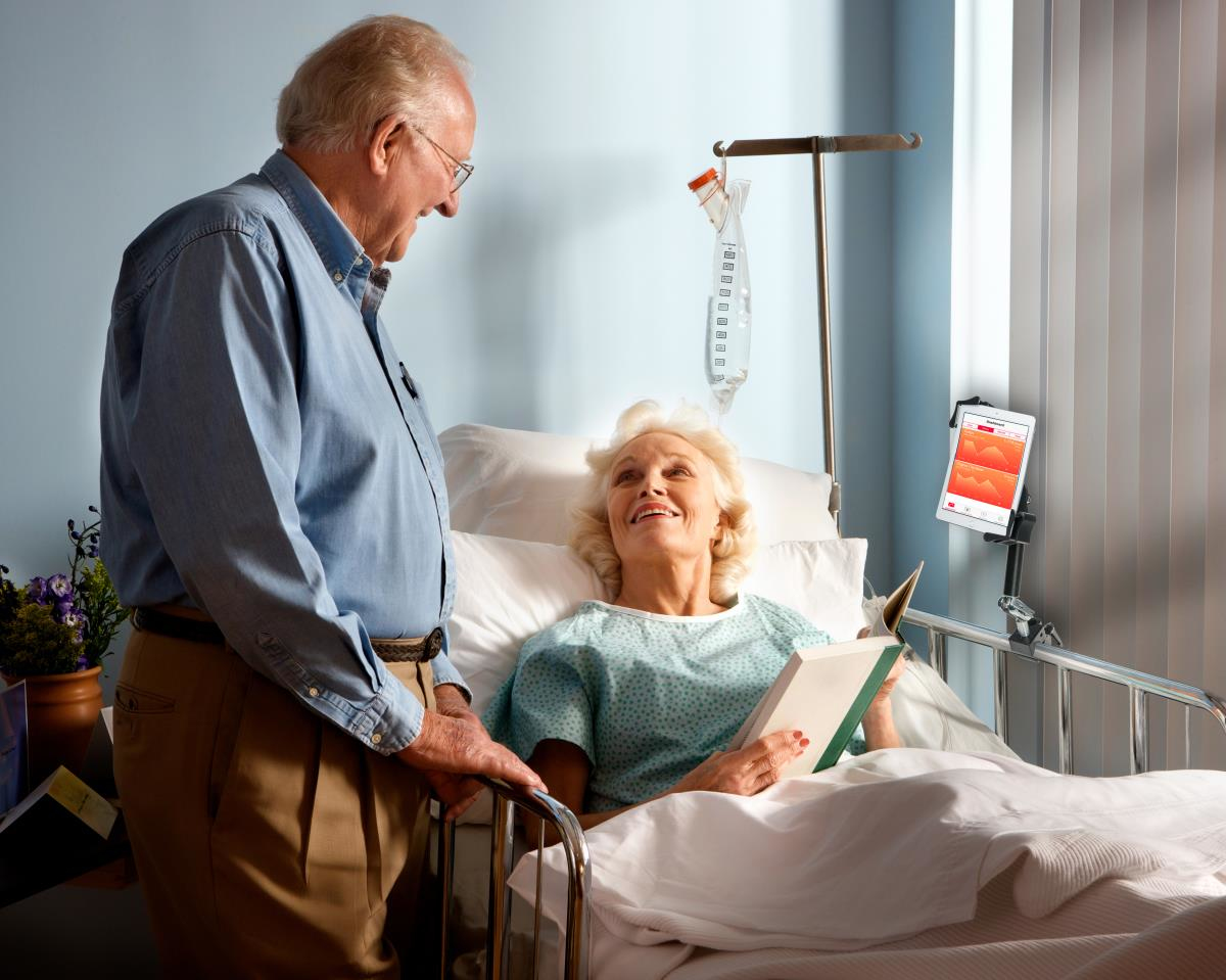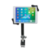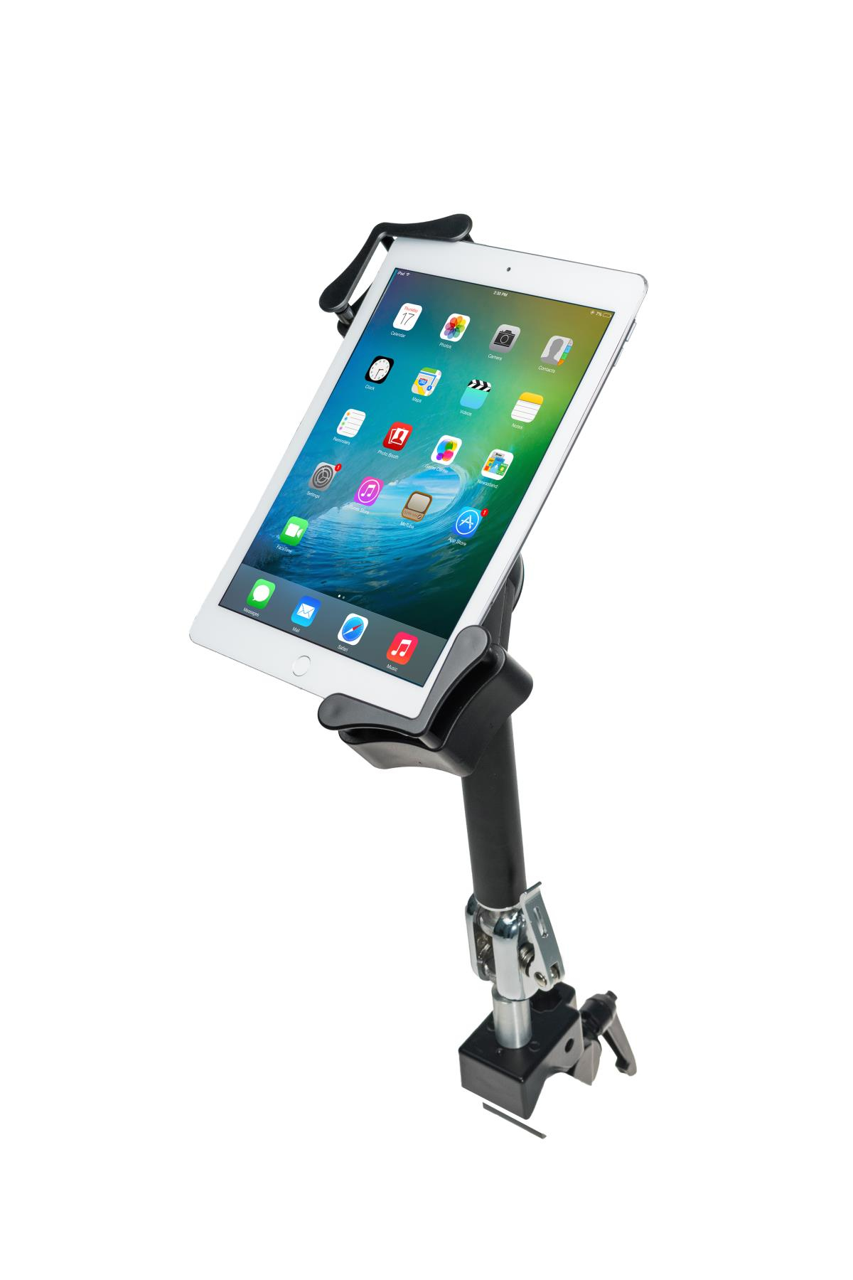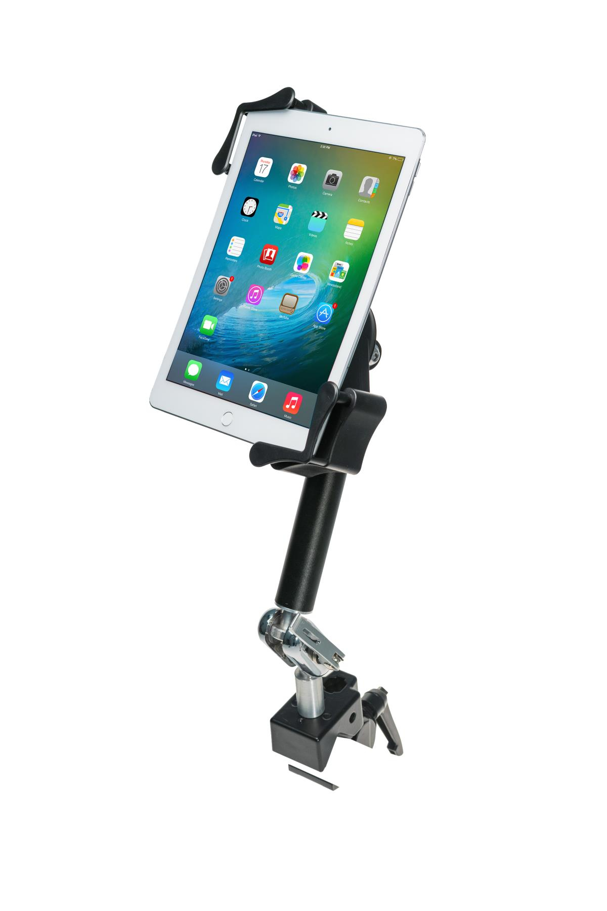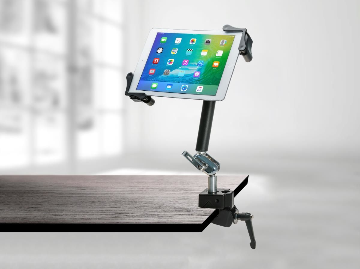 This heavy-duty tablet mount is designed for ease of use and rugged applications. The arm’s tilting, rotating joint allows custom positioning and can be fixed in position with a folding clasp. The adjustable clamp uses powerful rubber grips and a rotary tightening mechanism to give you fast, easy setups on cylindrical objects like warehouse machinery, hospital bed rails, and wheelchairs. The clamp also adjusts to fit flat surfaces like desks, tables, and countertops. The slide adjustable tablet holder tilts side to side and rotates a full 360 degrees to accommodate both portrait and landscape orientations. The arm also features clean interior cable routing for neat charging while in use.