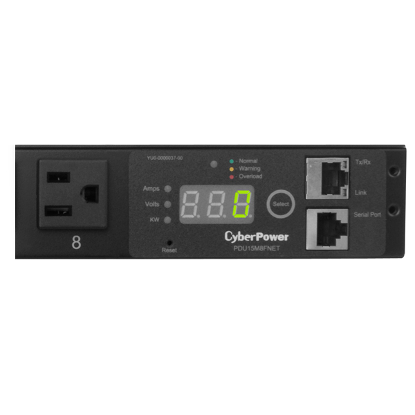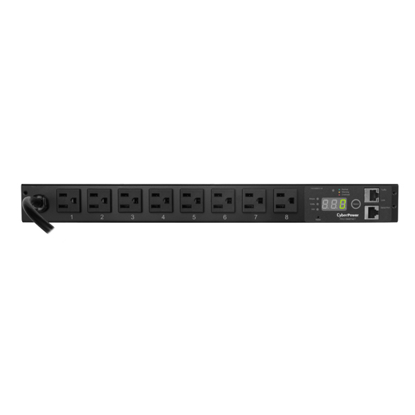 The CyberPower (PDU15M8FNET) 8-outlet 1U rack mount monitored power distribution unit (PDU) provides 120V 15A output. It distributes power to 8 NEMA 5-15R receptacles from a single NEMA 5-15P plug, with unfiltered electrical pass-through. Power status can be monitored over the network, using CyberPower Management Console and the RJ45 Ethernet port for network connection, or locally using the LCD.