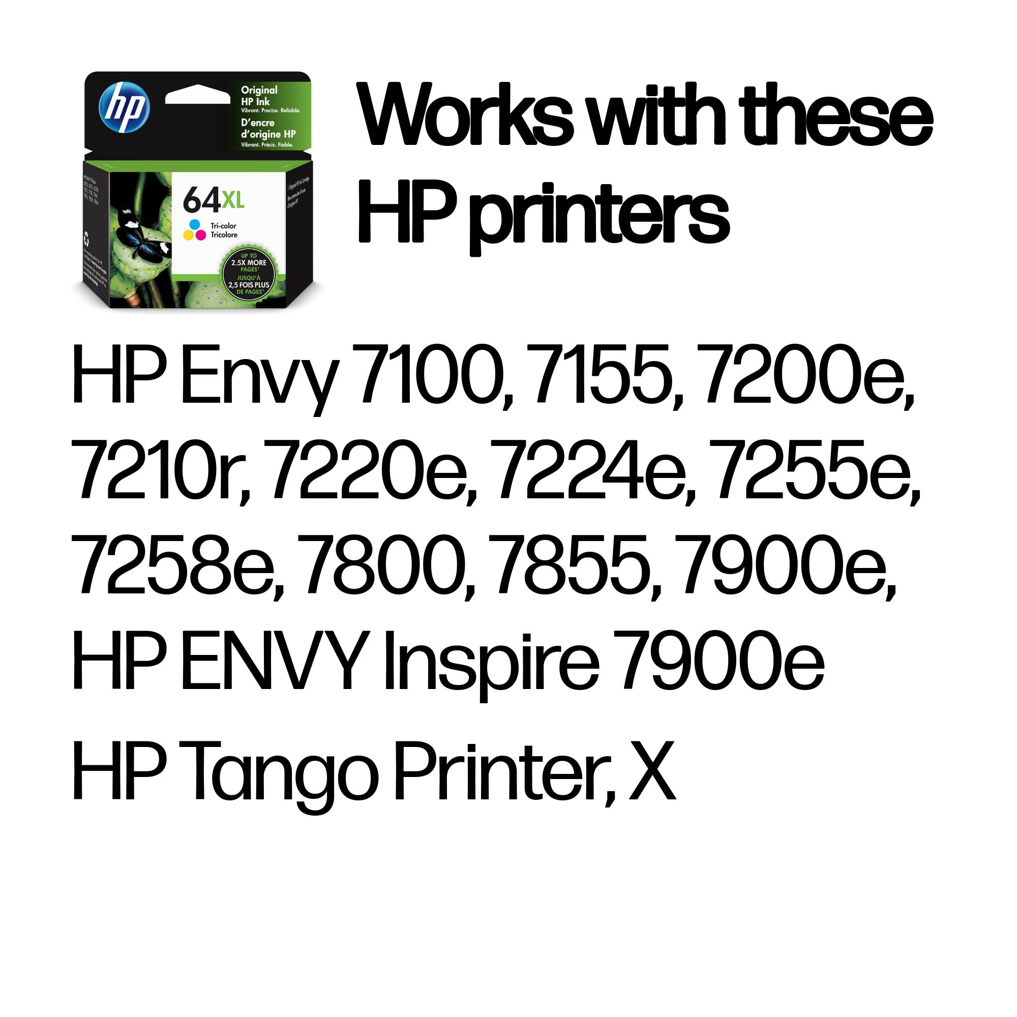 HP 64XL High Yield Tri-color Original Ink Cartridge. Colour ink type: Pigment-based ink, Cartridge capacity: High (XL) Yield, Color ink page yield: 415 pages, Color ink volume: 10 ml, Printing colors: Cyan, Magenta, Yellow