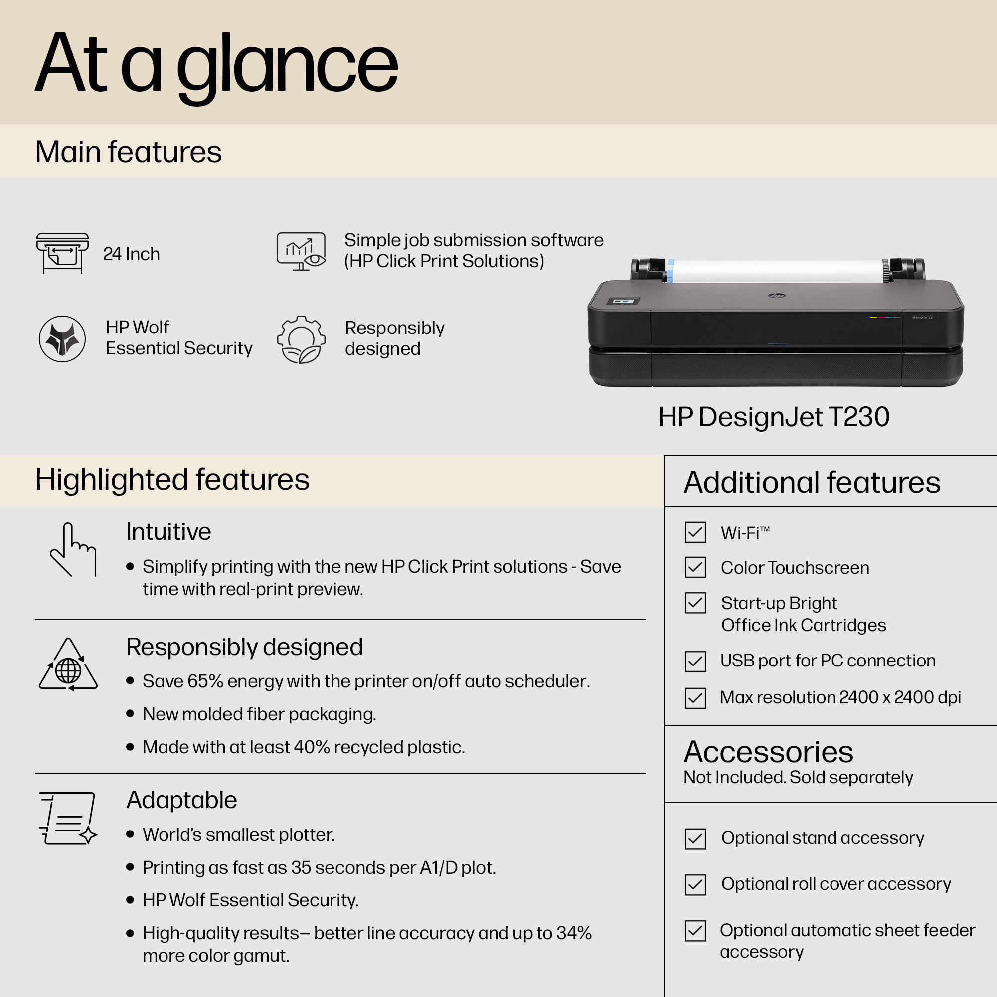 | Box contents | HP DesignJet T230 24-in Printer, printhead, introductory ink cartridges, spindle, quick reference guide, setup poster, power cord |