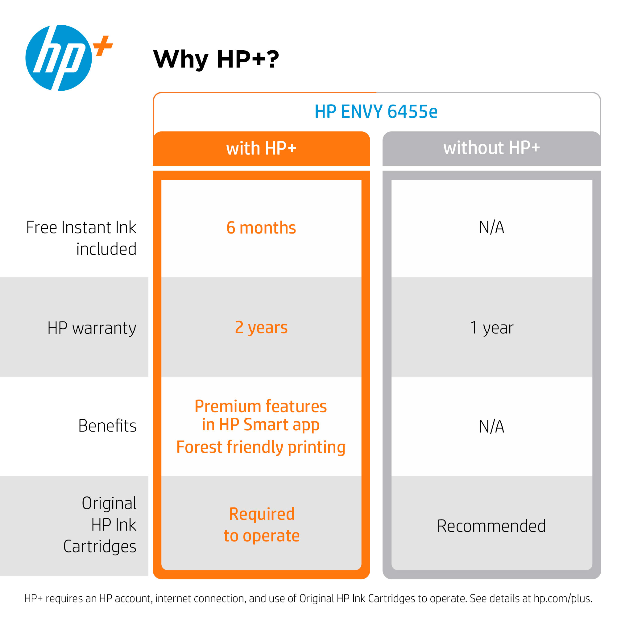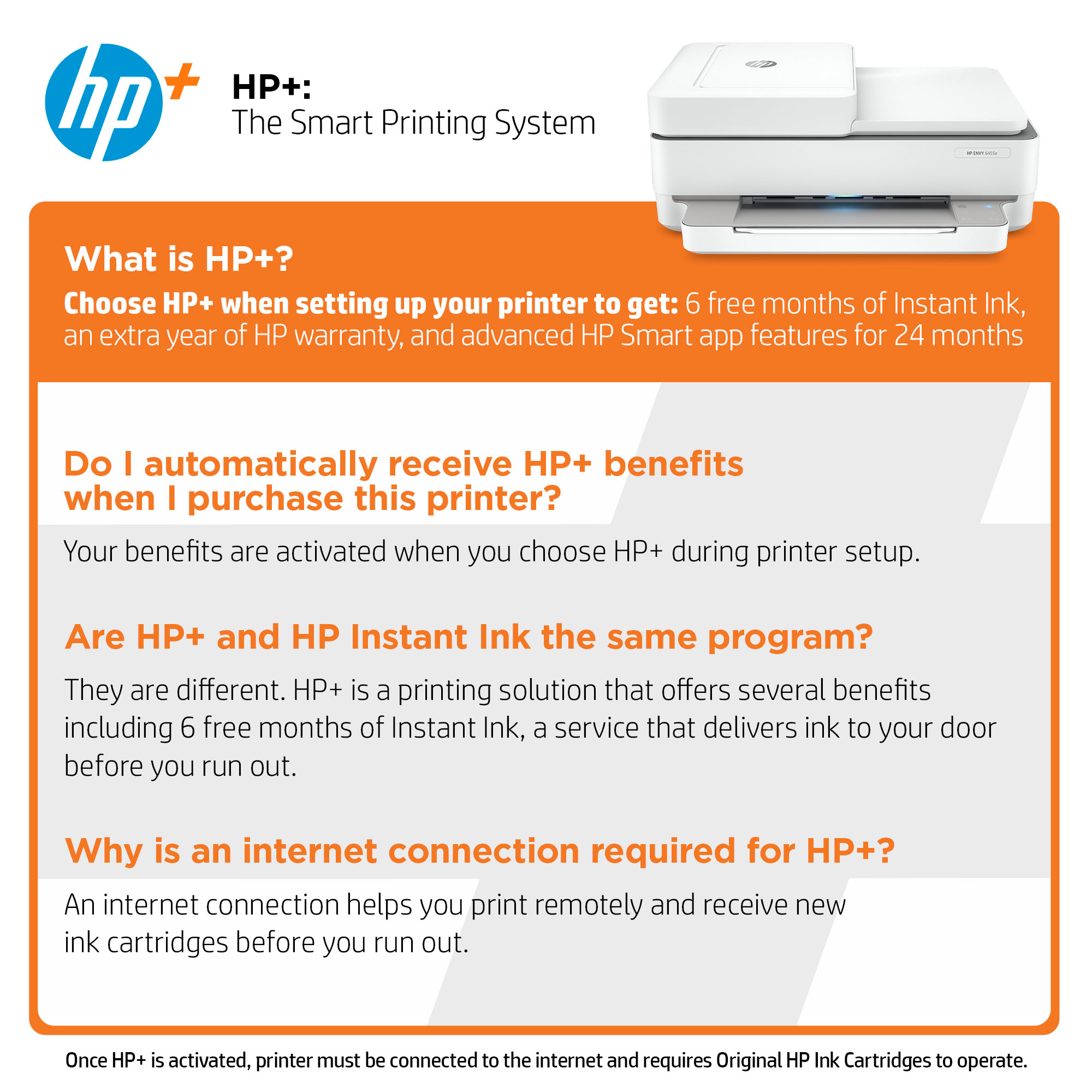 HP+ requires an HP account, internet connection, and use of original HP ink for the life of the printer.