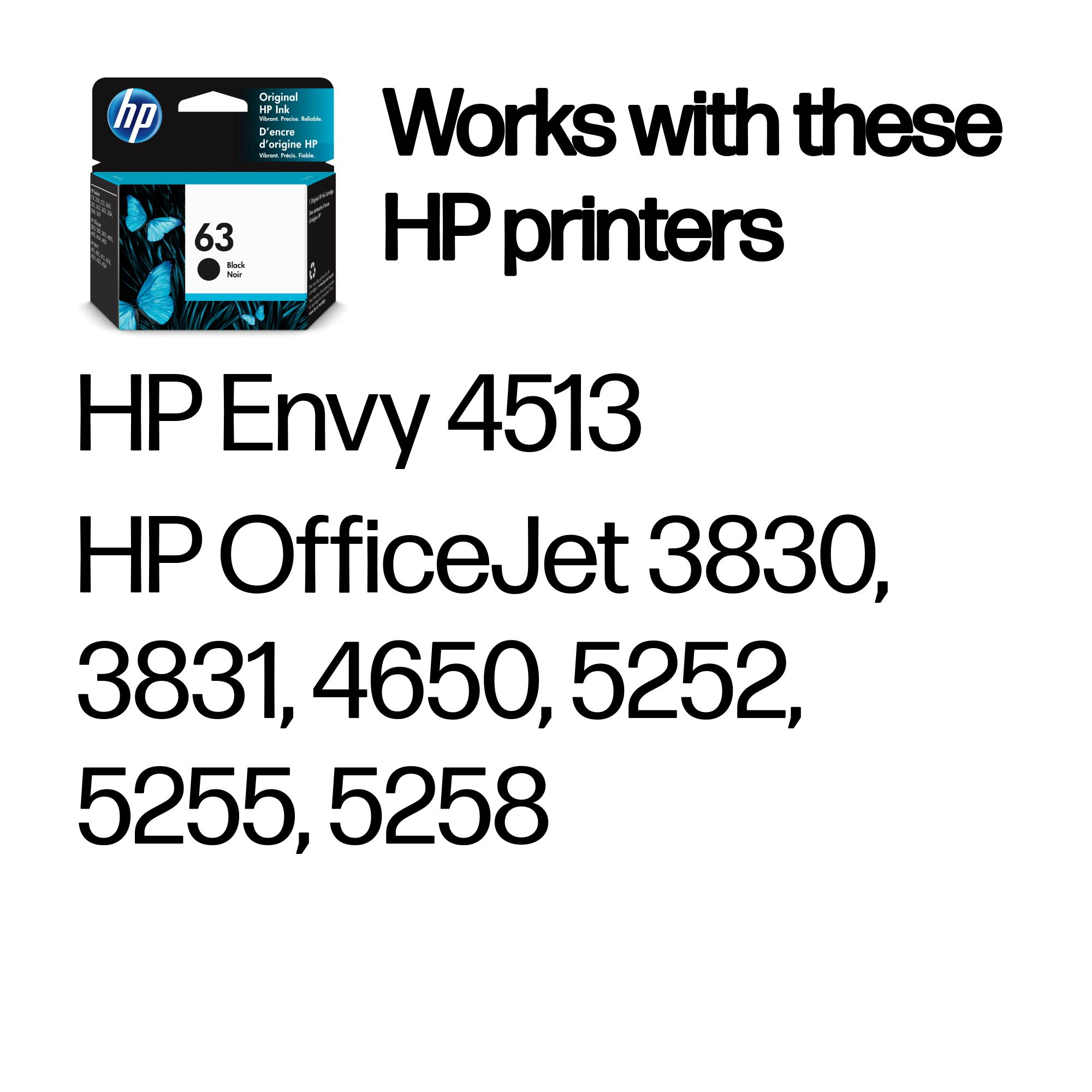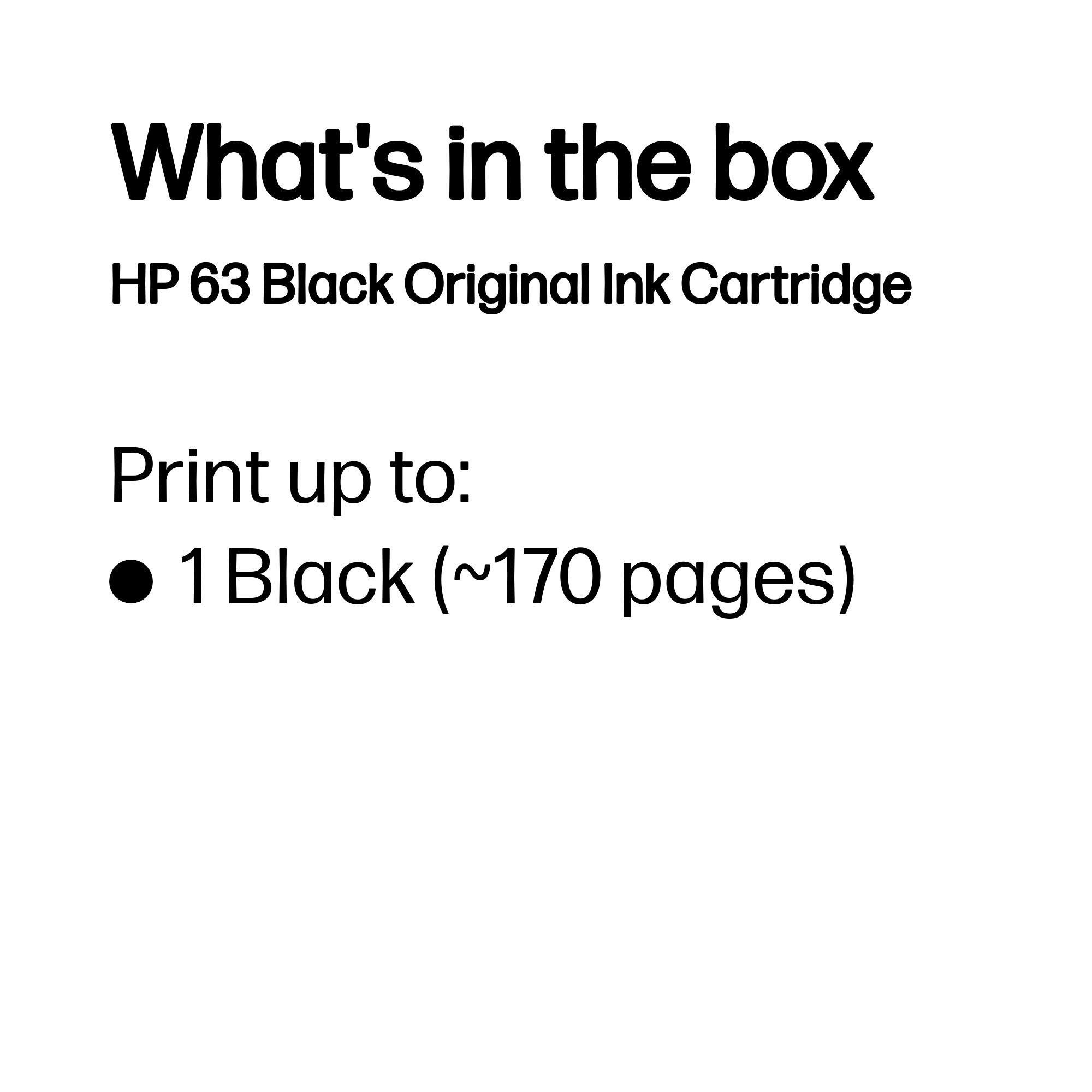 HP 63 Black Original Ink Cartridge. Black ink type: Pigment-based ink, Cartridge capacity: Standard Yield, Printing colors: Black, Quantity per pack: 1 pc(s), Black ink page yield: 170 pages