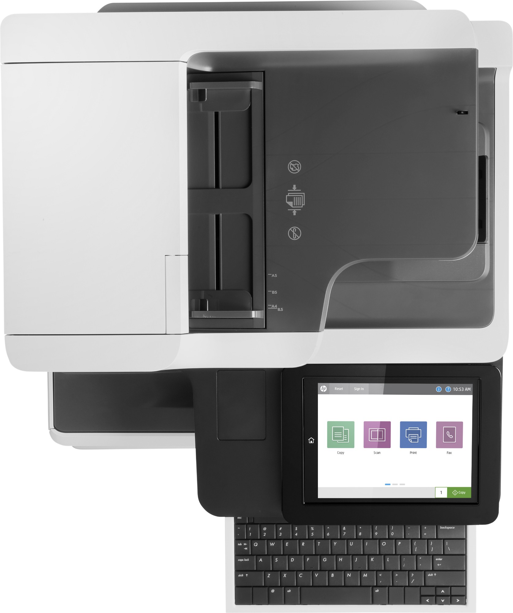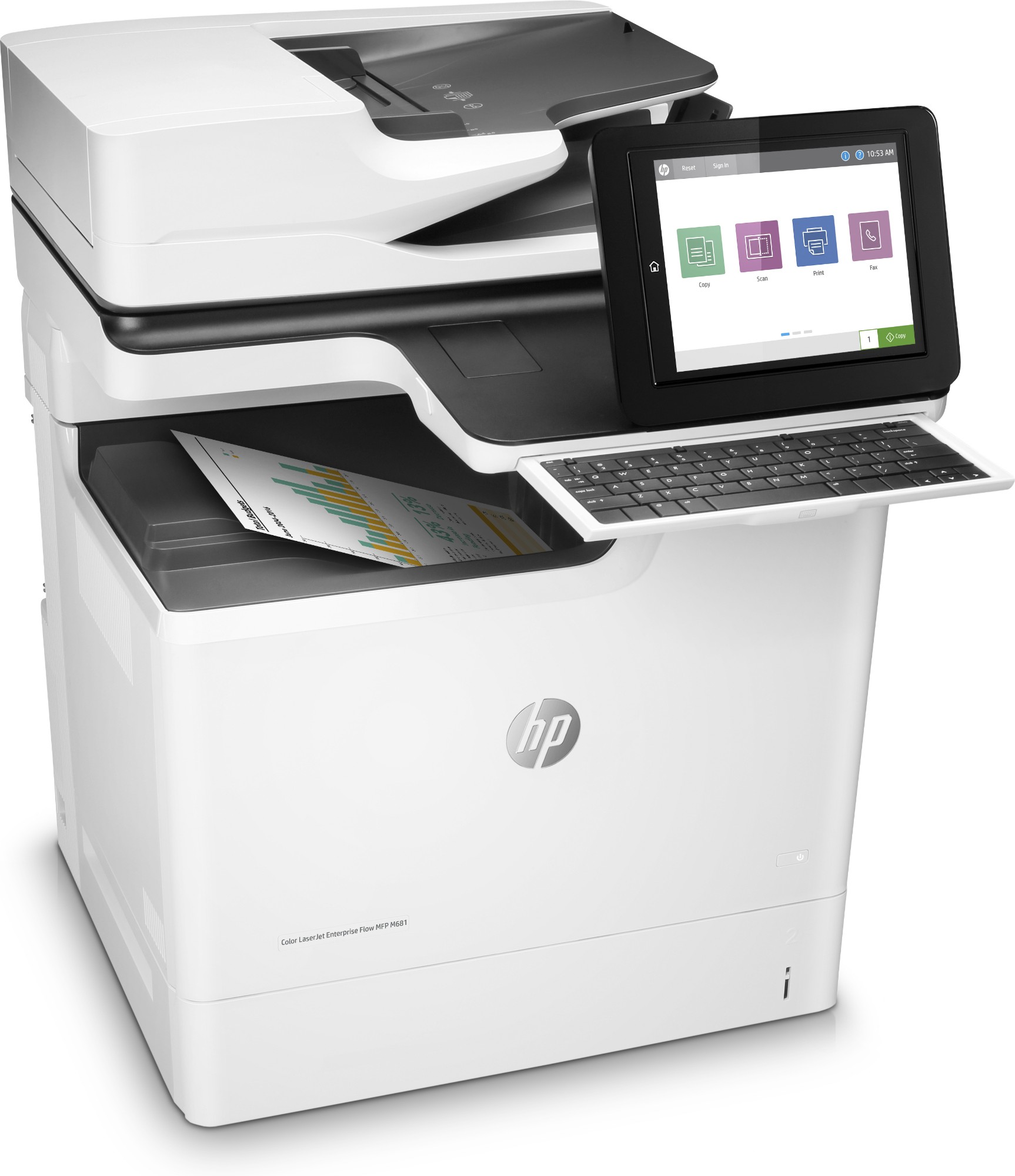 HP LaserJet Color Enterprise Flow MFP M681f. Print technology: Laser, Printing: Color printing, Maximum resolution: 1200 x 1200 DPI, Print speed (color, normal quality, A4/US Letter): 50 ppm. Copying: Color copying, Maximum copy resolution: 600 x 600 DPI. Scanning: Color scanning, Optical scanning resolution: 600 x 600 DPI. Faxing: Color faxing. Maximum ISO A-series paper size: A4. Direct printing. Product color: Black, White