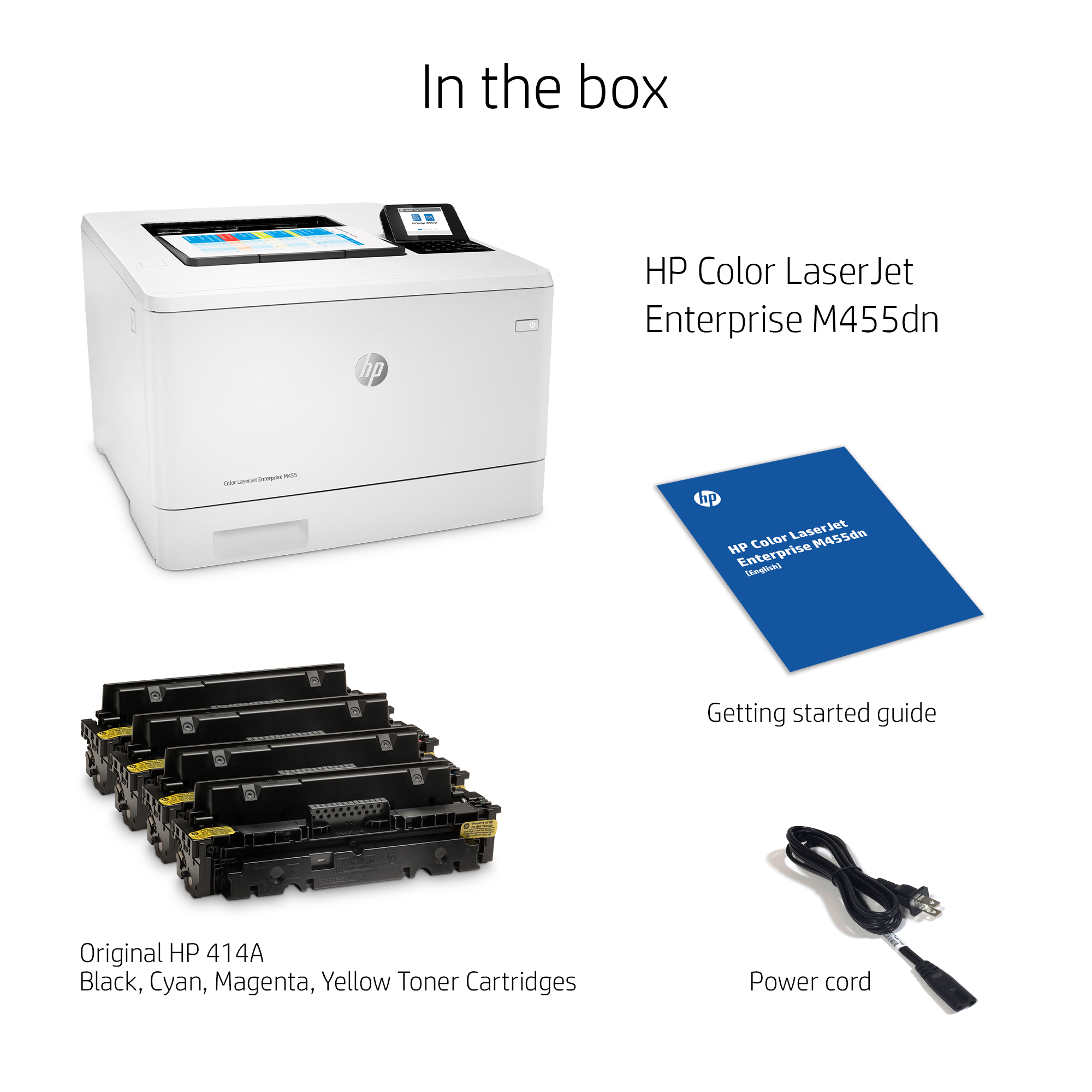 | Box contents | HP Color LaserJet Enterprise M455dn printer; HP Black Original LaserJet Toner Cartridge (~2,400 pages); HP Cyan, Magenta, Yellow Original LaserJet Toner Cartridges (~2,100 pages each); Getting started Guide; 1 Power cord |