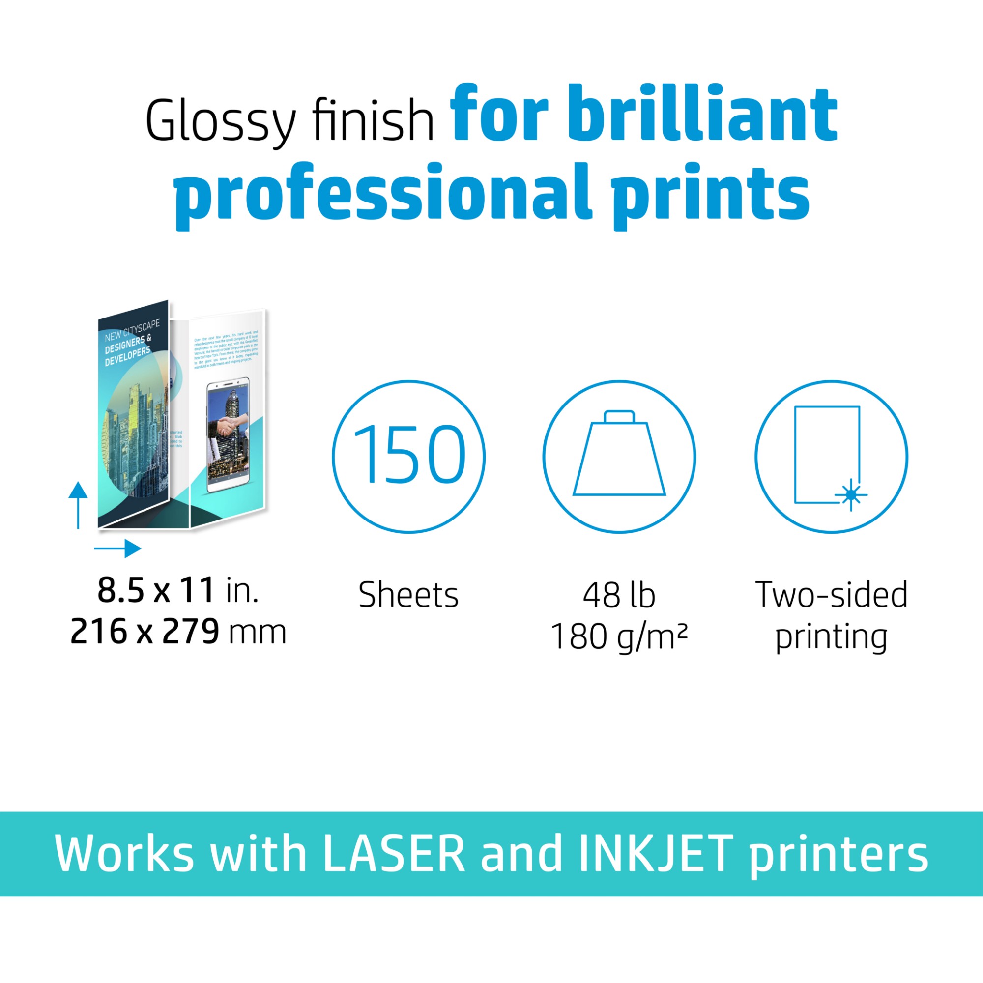 HP Professional Tri-Fold Business Paper Glossy 48 lb 8.5 x 11 in. (216 x 279 mm) 150 sheets