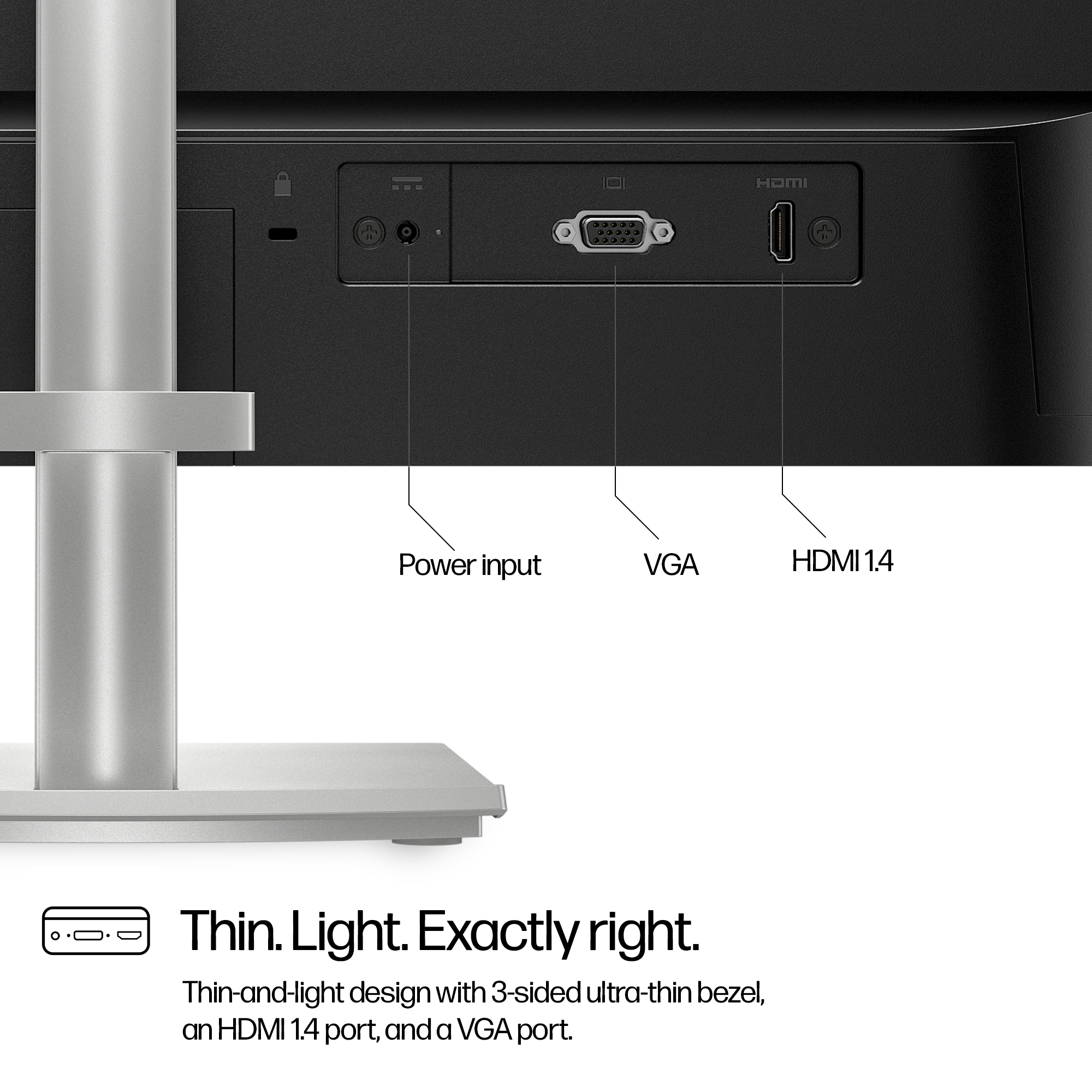 Discover a beautiful 23.8" FHD monitor with a thin-and-light design and simplified cable management that fits your style and maximizes your space. Its sleek, 3-sided ultra-thin bezel lets you stay immersed and focused to what’s on screen. Pair a second monitor to create a virtually seamless expansive view, while keeping every device connected and ready with HDMI and VGA ports for a better way to be productive.