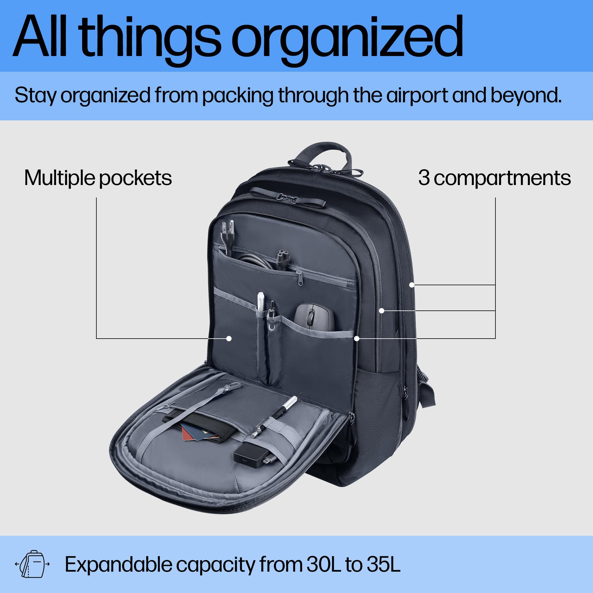 Stay organized with three compartments and multiple pockets, including two quick access pockets, for all your essentials. Expand the capacity from 30L to 35L to fit everything you need for your business trip–tech, clothing, packing cubes, and more–in one bag.
