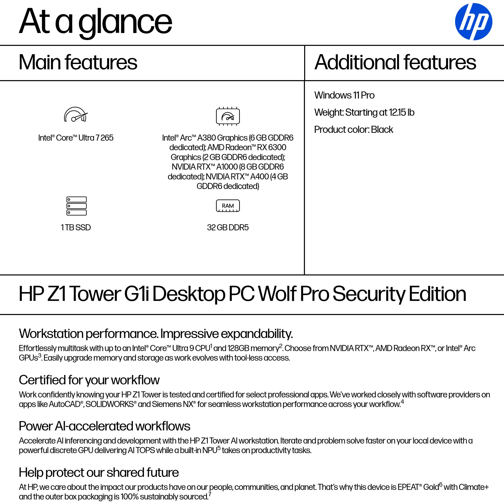 HP Z1 Tower G1i Desktop PC Wolf Pro Security Edition Intel Core Ultra 7 265 32 GB DDR5-SDRAM 1 TB SSD Windows 11 Pro Workstation AI Workstation, AI PC Black