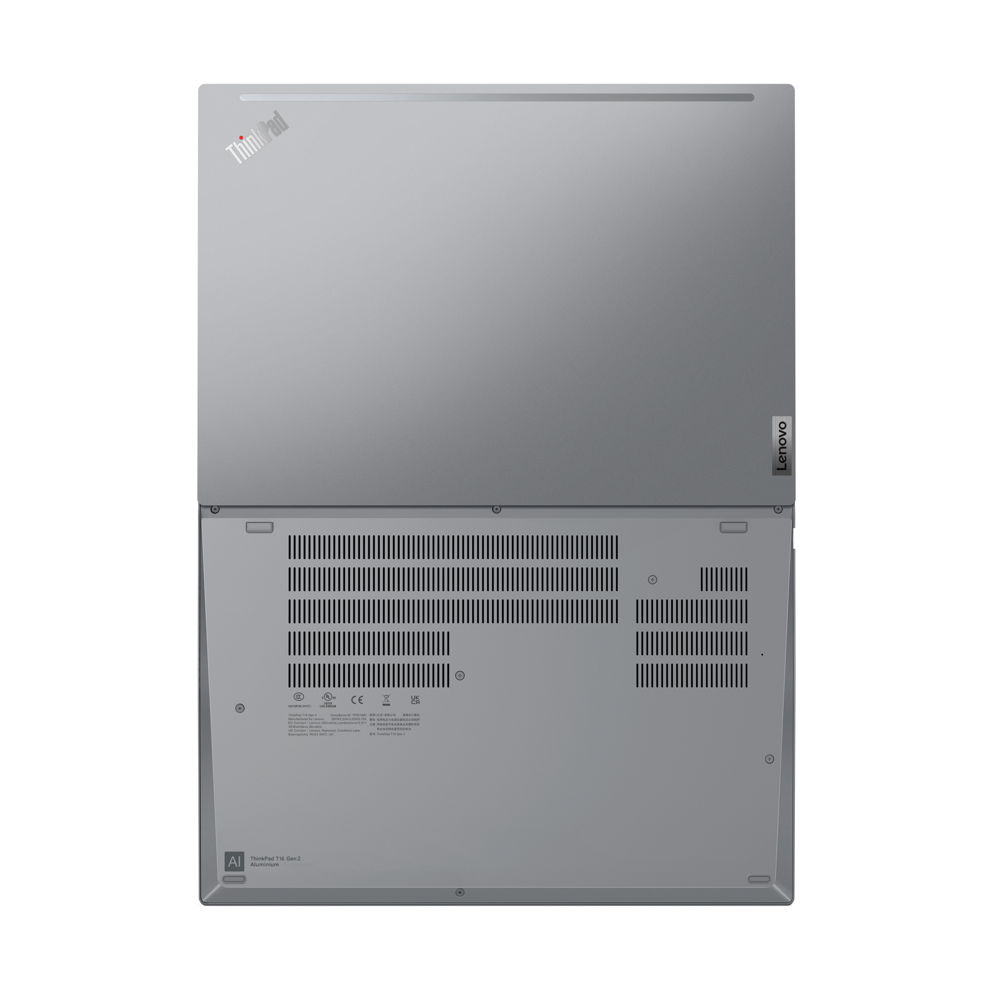The ThinkPad T16 Gen 2 laptop features a number of sustainable components including post-consumer content recycled plastic in the enclosures for the speaker, battery, and AC adapter. Packaging is plastic-free with 90% recycled and/or sustainable content, and the manufacturing process uses low-temperature soldering. The Storm Grey models include certified recycled aluminum (50% top cover, 55% bottom cover). Both colours feature 90% magnesium on the C frame (surrounding keyboard).