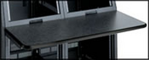Console work surfaces are available with a beveled oak bullnose edge trim, or an attractive economical black T-mold edge trim. All work surfaces are 18” deep, feature a durable graphite laminate top and include all necessary mounting hardware to simplify ordering. Work surface support brackets do not impede any useable rackspace, extending the usability of each console bay.