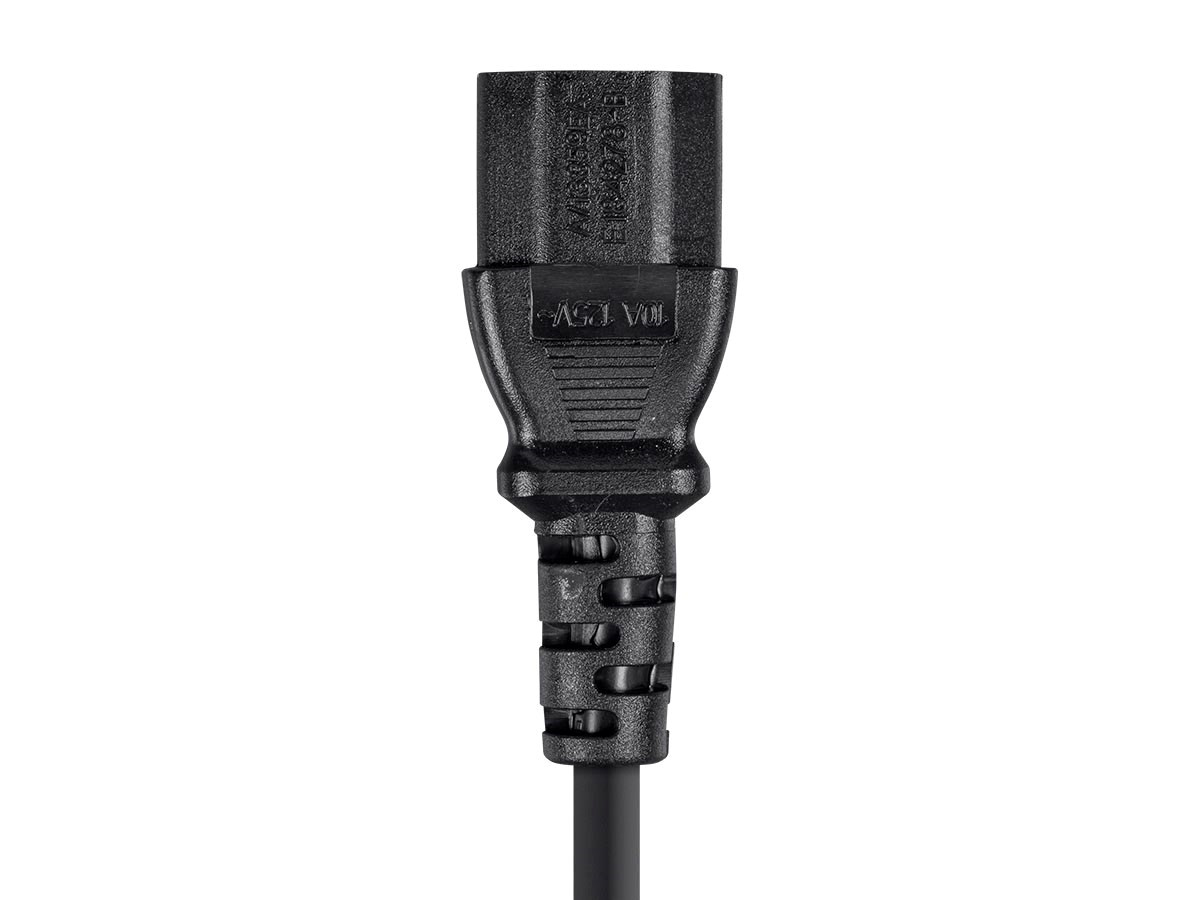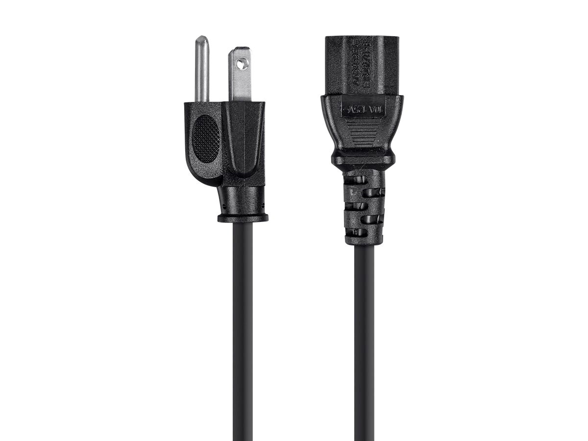 Connect your computer, monitor, power adapter, or other device with a male IEC 60320 C14 panel connector to a standard US AC wall outlet using this cable. This cable features a standard, ground NEMA 5-15P plug on one end and an IEC 60320 C13 connector on the other end. Simply mate the female C13 connector with the male C14 connector on your device, then plug the NEMA connector into a nearby AC power outlet, UPS, or other AC power source.