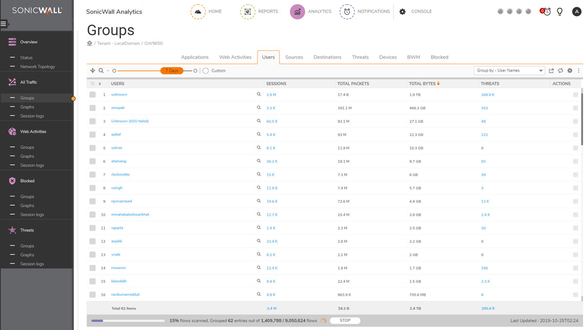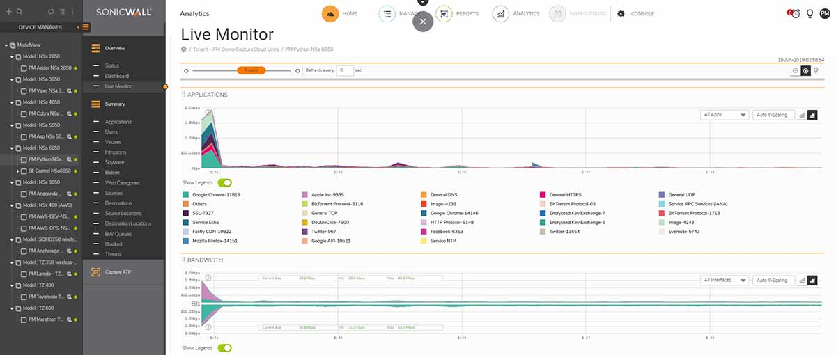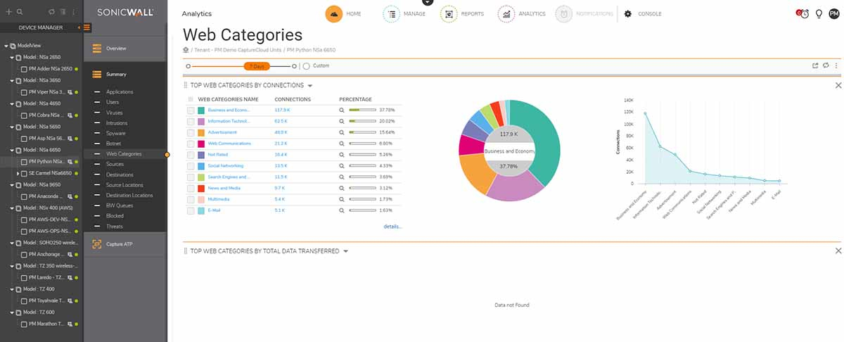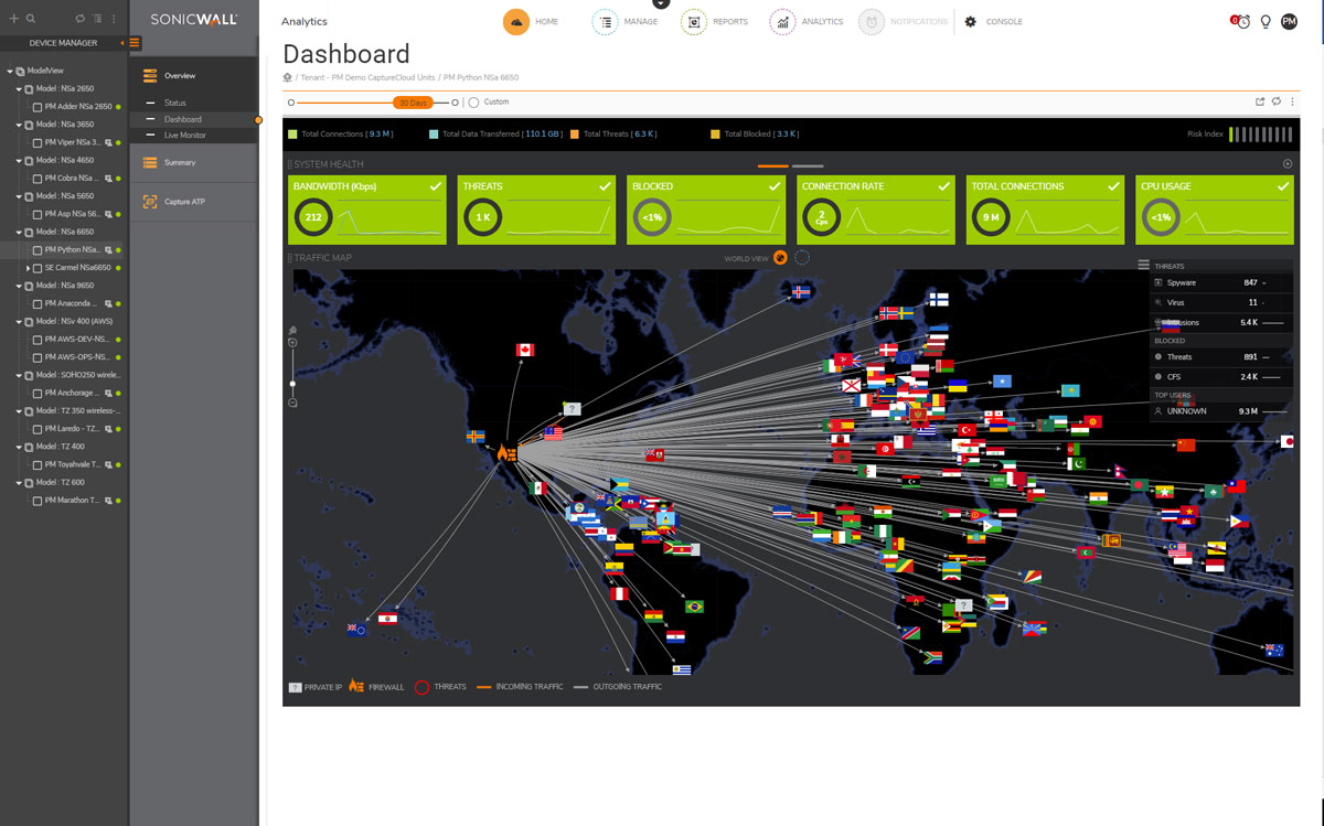 SonicWall Analytics is a powerful intelligence-driven analytic service. It gives a direct line of sight into the threat intelligence of your networks and users in real time, all through a single pane of glass. With drill-down capabilities, security teams can mine various sets of contextualized firewall log and flow data to easily find and tackle security as well as network performance issues quickly.