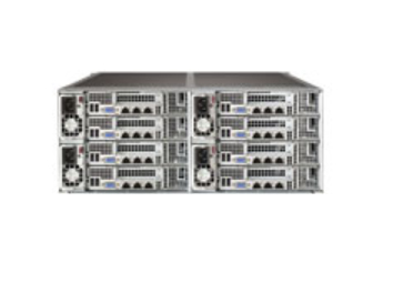 8 Hot-plug System Nodes in 4U, Intel Xeon E5-2600 v3 CPU, 1TB ECC LRDIMM DDR4 Max, Intel C612 Express chipset, 48 x 2.5" Hot-swap SAS2 / SATA3 (6Gbps) HDD Bays, 64 x SATA3 (6Gbps), 16 x SATA3 powered, 16 x RJ45 10GBase-T, 8 x RJ45 Dedicated IPMI LAN, 16 x USB 3.0, 8 x VGA, 8 x Serial Port / Header