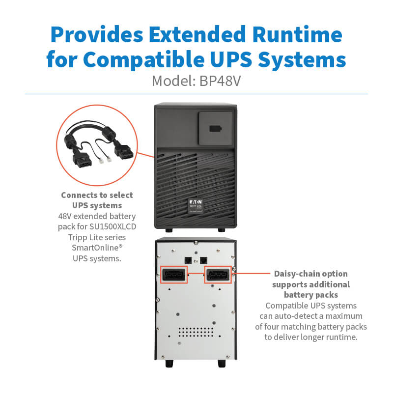 The valve-regulated lead-acid (VRLA) BP48V offers extended battery runtime when used in conjunction with the SU1500XLCD SmartOnline® UPS system. It can also be daisy-chained for a maximum of four matching battery packs to deliver even longer extended-run operation. Heavy-gauge cabling with high-current DC connectors is included for safe, simple installation.