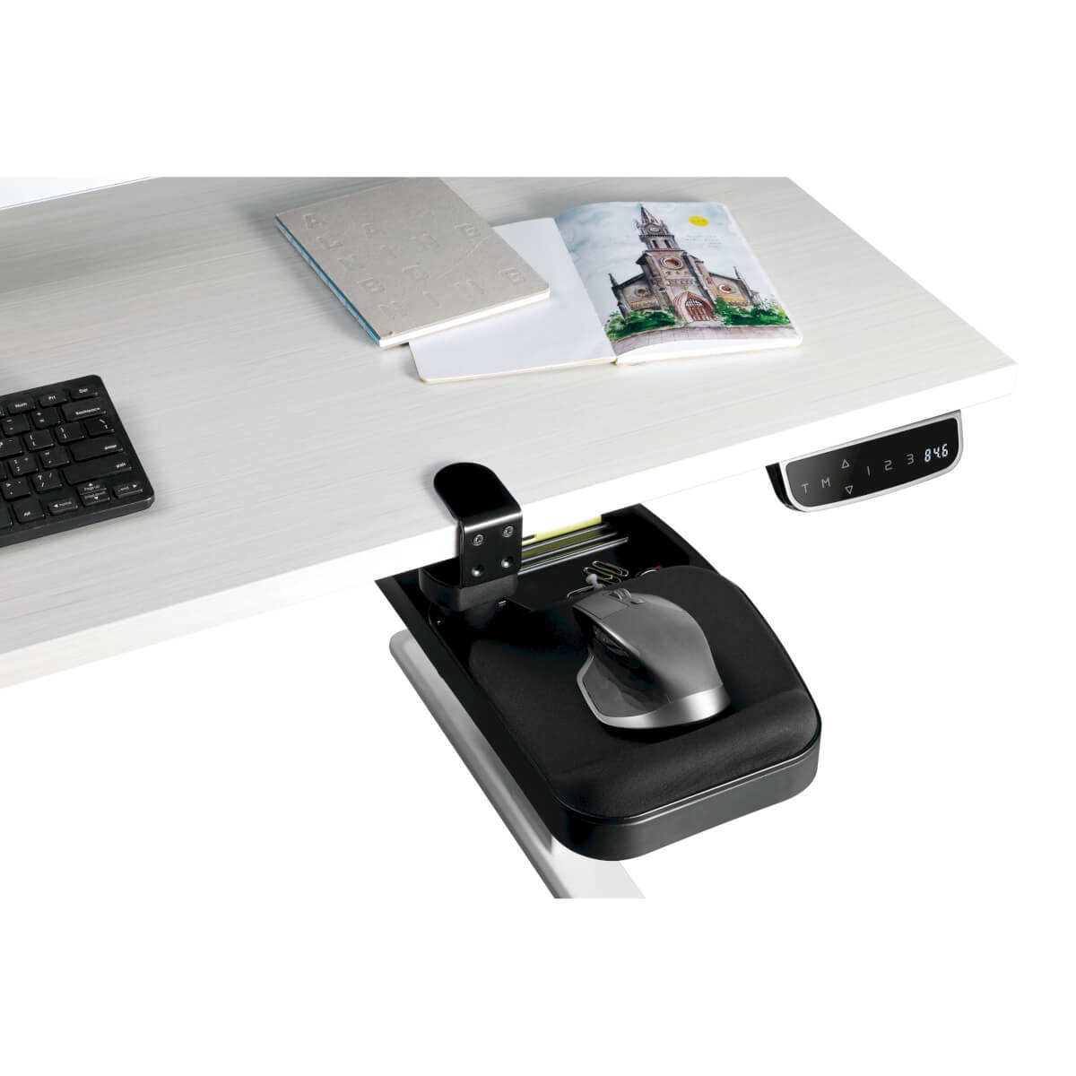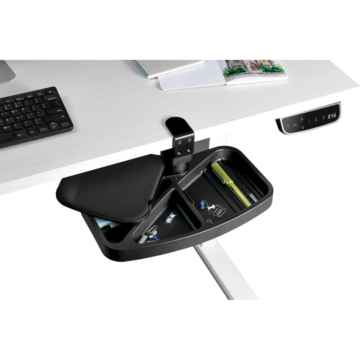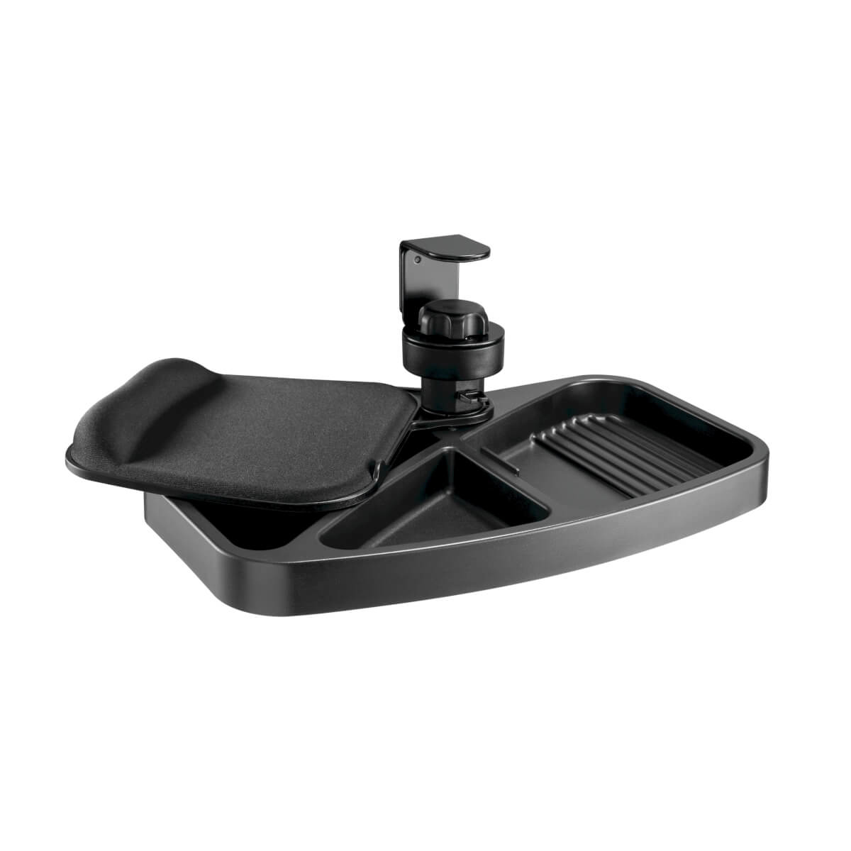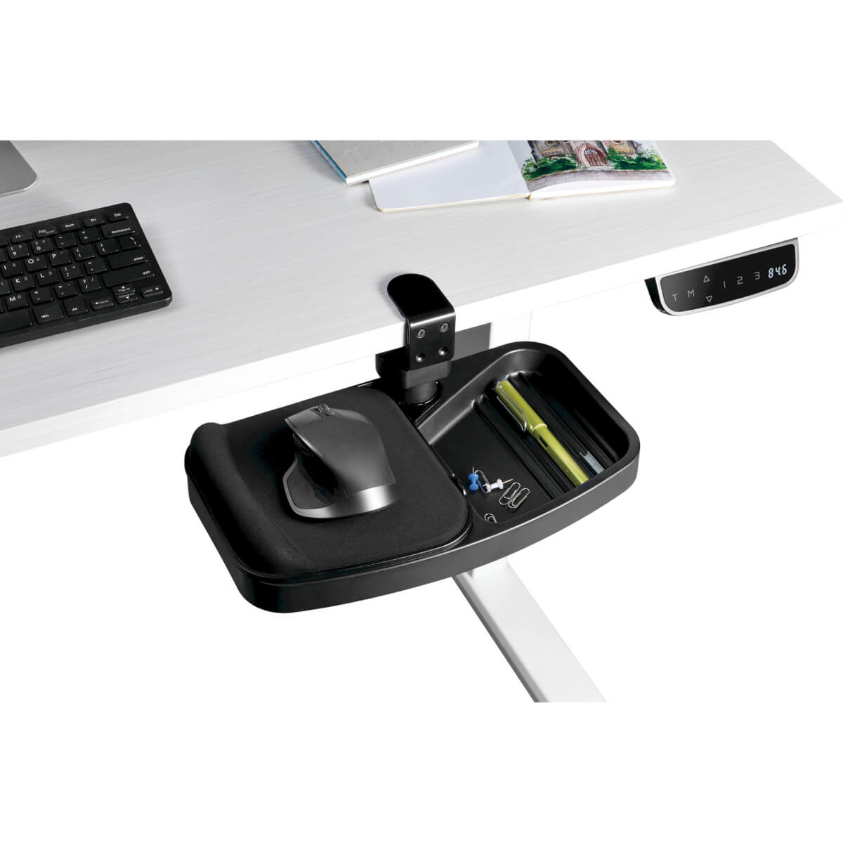 Under-Desk Clamp-On Storage Tray with Built-In Mouse Pad and Wrist Rest