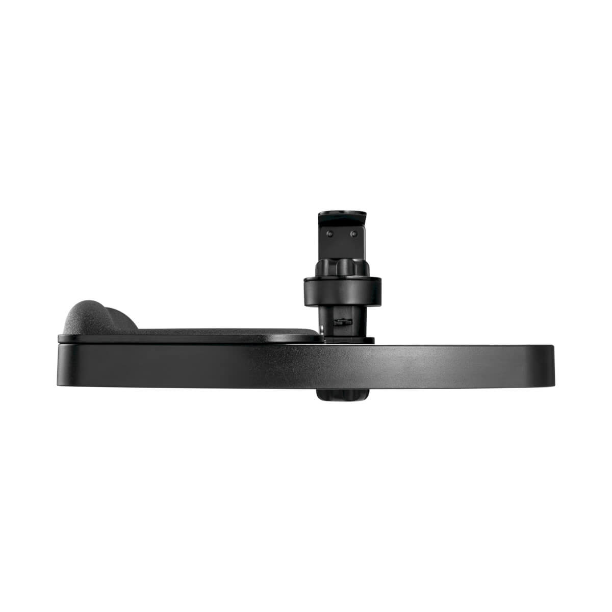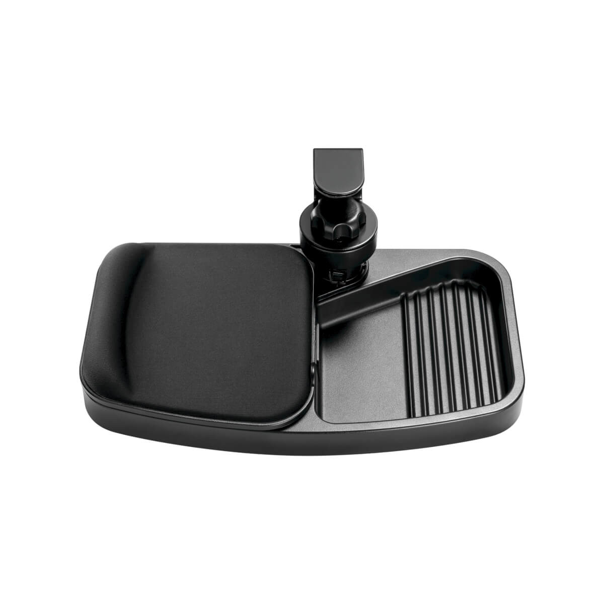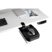 A generously sized mouse pad with a smooth-glide surface and soft wrist rest fits most standard mice. The mouse pad swivels to either side to accommodate both right- and left-hand users. The entire unit rotates 360 degrees and swivels out of sight beneath the desk surface when not in use.
