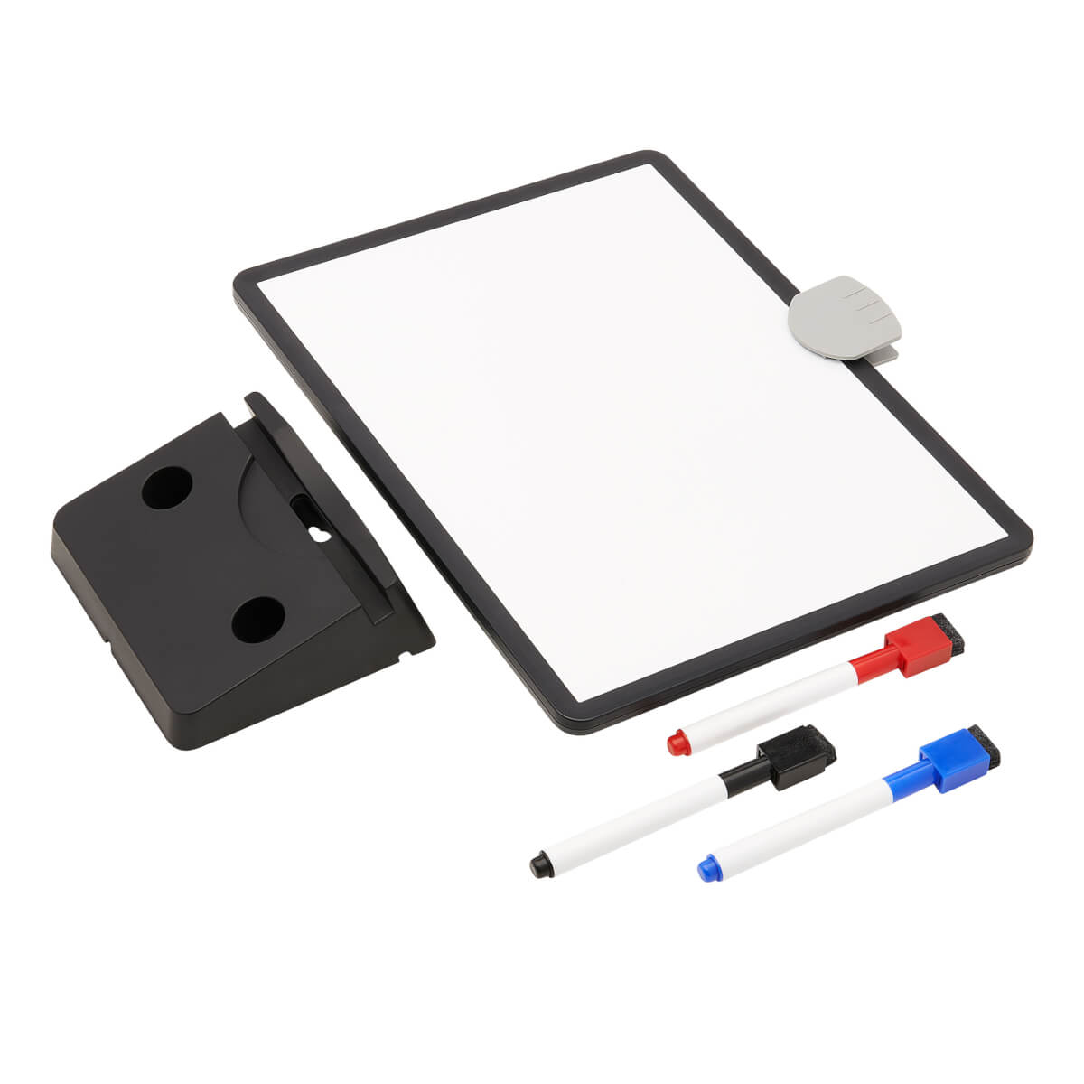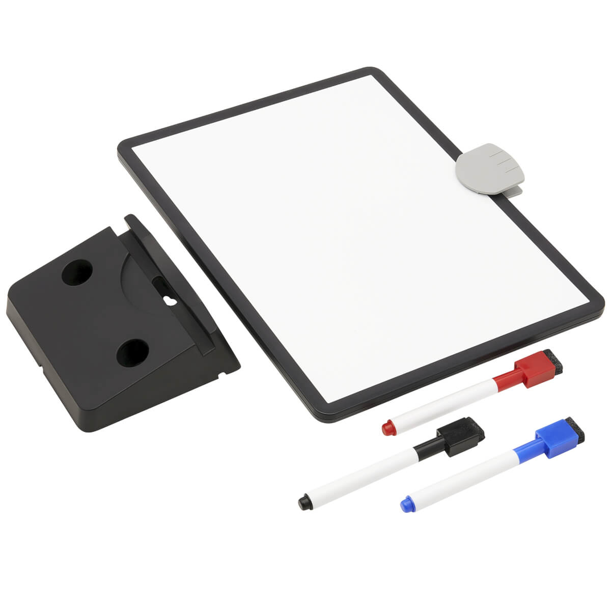 Ideal for taking quick notes, reminding you of upcoming tasks or sharing information at school or the office, this write-on/wipe-off whiteboard fits perfectly into any education or corporate setting. It comes with three markers (red, blue and black) for writing on the board’s 8.5 x 11.5-inch magnetic surface. The magnetic markers with erasers built into their caps secure to the whiteboard to prevent them from becoming lost. A removable document clips attaches notes to the board for easy reviewing.