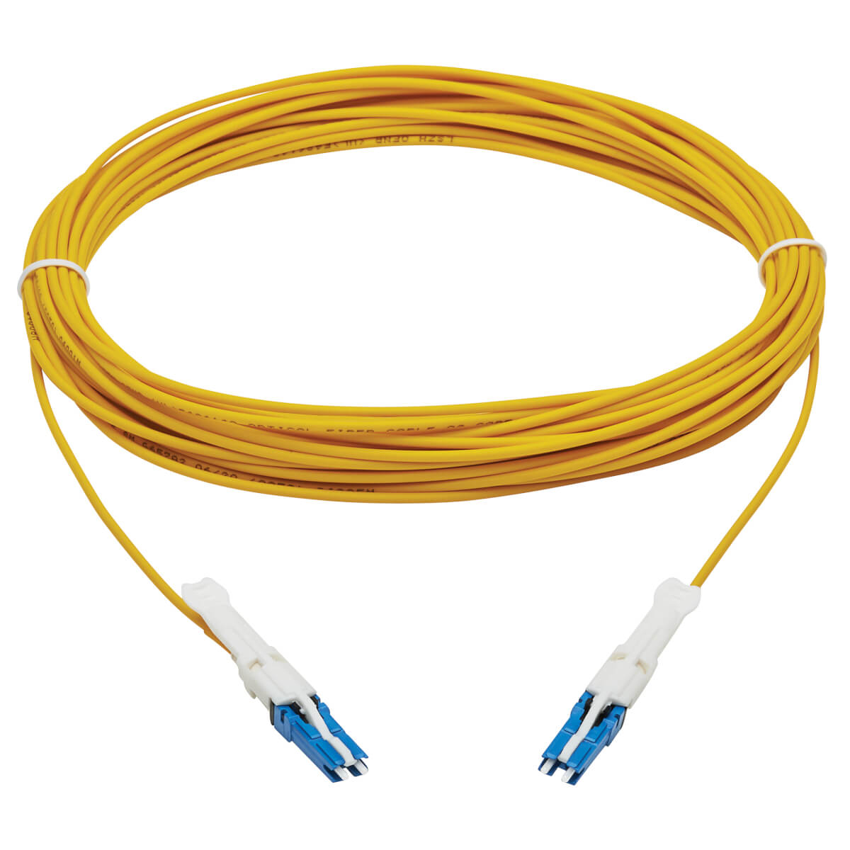 The OS2-rated cable has a yellow jacket, which is easy to identify quickly in a crowded patch panel or switch and helps prevent the cable from becoming accidentally disconnected. The round low-smoke zero-halogen (LSZH) jacket limits the amount of toxic smoke emitted in case of combustion, making it suitable for poorly ventilated areas. It also complies with G657A2 bend-insensitive fiber standards, which allows for easy installation without excessive care when storing the fiber due to the increased bend radius.