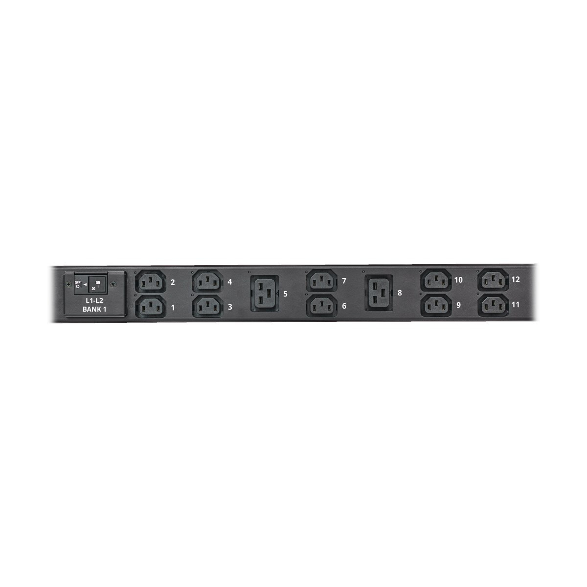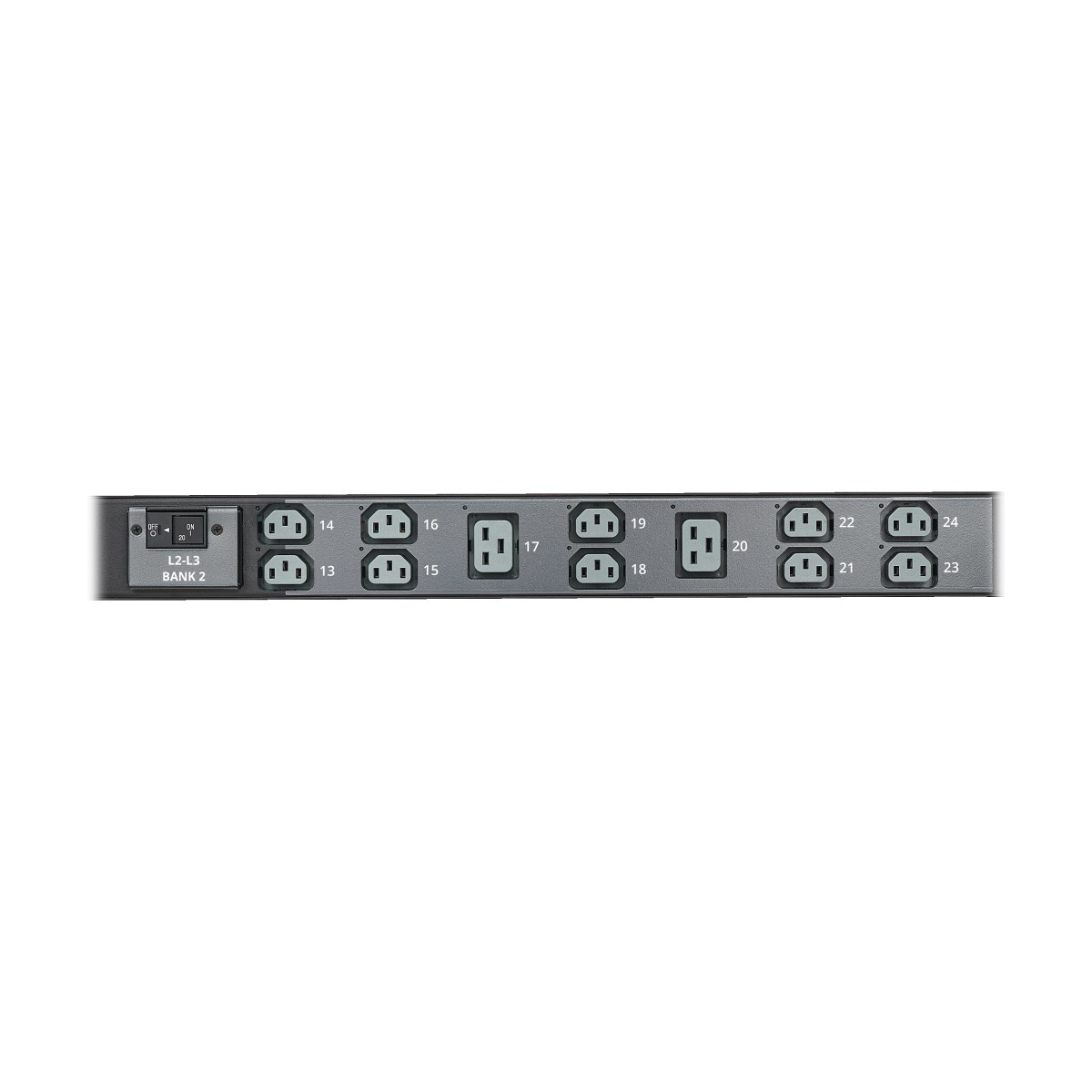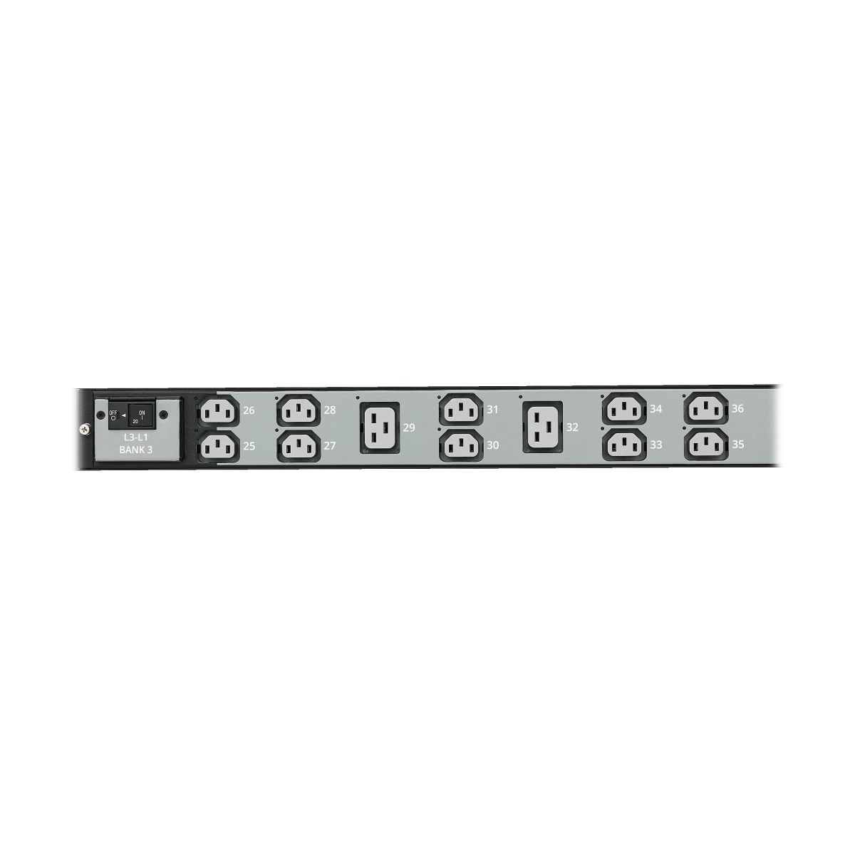 During normal operation, 36 individually controllable outlets—30 C13 and six C19—in three load banks distribute AC power to rack equipment. Each 200–240V outlet is accompanied by an LED that illuminates when the outlet is ramped up and ready to be used. The outlets and banks can be individually monitored to ensure proper load levels and load balancing.