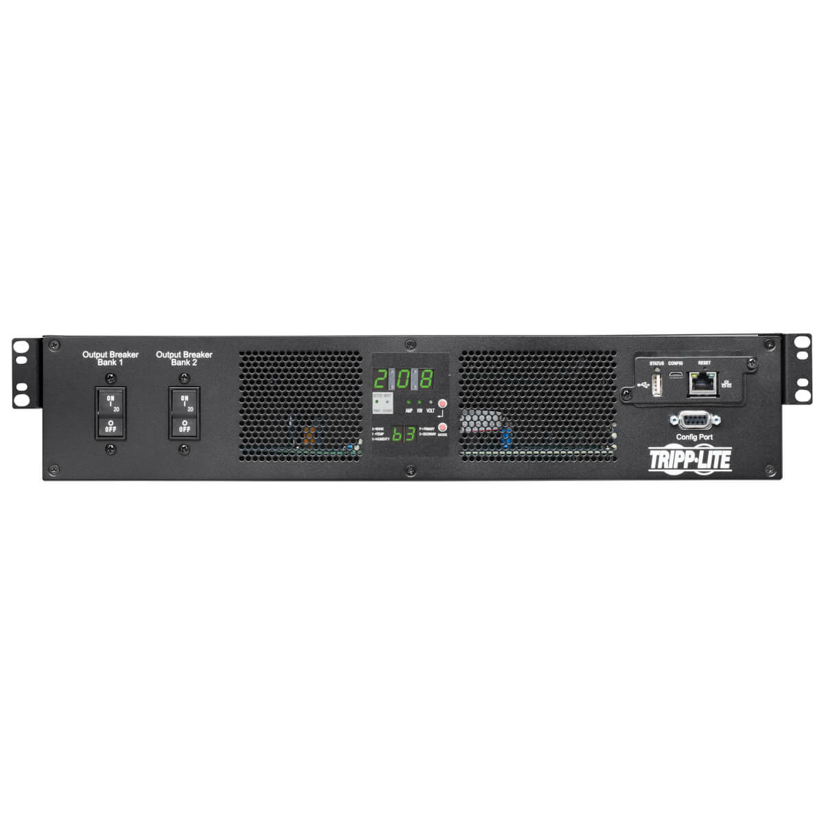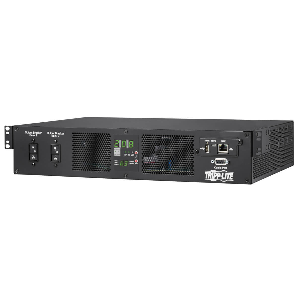 This monitored rack PDU (rPDU) provides real-time remote monitoring of voltage, frequency and load levels via its built-in network interface. Ideal for network IT applications, small computer rooms and other equipment rack applications, the PDUMNH32HVAT2 features 16 C13 and 2 C19 outlets in two load banks, each bank protected by a 20A circuit breaker. Dual three-meter power cords with IEC 309 32A Blue inputs connect to separate primary and secondary mains circuits, backup generators, UPS systems or utility power grids, including out-of-phase sources.