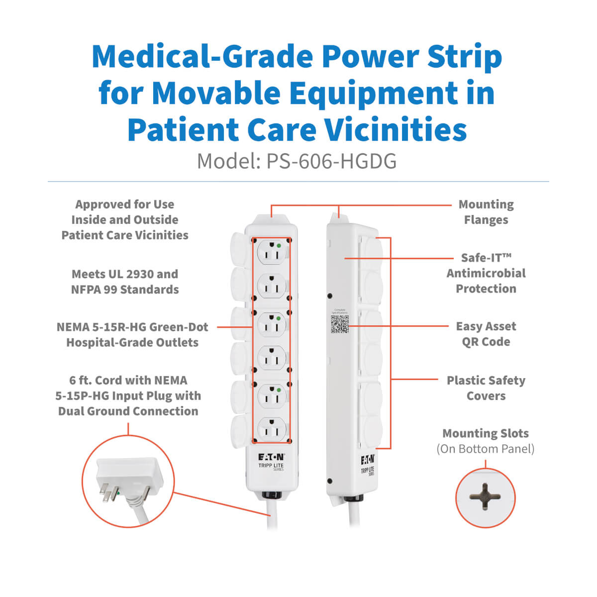The PS-606-HGDG features six NEMA 5-15R-HG "green dot" hospital-grade outlets that supply power to medical equipment used inside patient care vicinities, including operating rooms, therapy rooms and imaging environments. It meets UL 2930 standards with a NEMA 5-15P-HG plug that provides redundant ground connection. The innovative input plug eliminates the need for an additional ground wire, which reduces cable clutter, the potential shock risk and risk of tripping to a patient in the event of a ground fault.