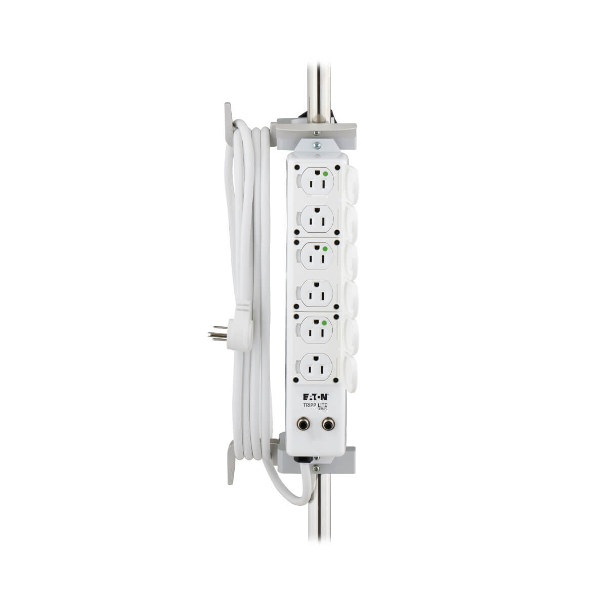 The power strip with 15-foot (4.6-meter) cord also includes a space-saving right-angle NEMA 5-15P-HG plug that helps you connect to a wall outlet located behind furniture that is placed flush against the wall. Built-in mounting flanges and integrated keyhole slots let you install the durable all-metal housing on any mobile cart or IV pole for distributing power to movable rack-, table- and pedestal-mounted equipment.