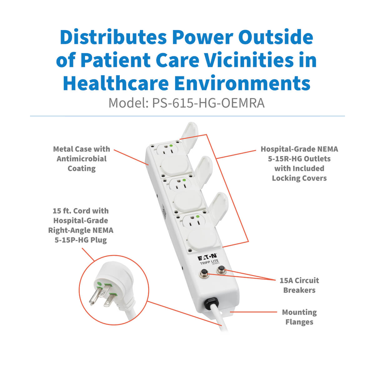 Tripp Lite's PS-615-HG-OEMRA supplies power to movable plug-connected components mounted to IV poles, mobile carts, crash carts and mobile medical workstations inside and outside patient care vicinities when properly mounted. This includes operating rooms, therapy rooms, imaging environments and administrative areas. Compliant with UL 1363A specifications, this 120V power strip features six NEMA 5-15R-HG hospital-grade outlets.