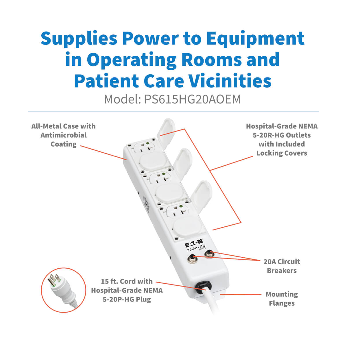 The PS615HG20AOEM Medical-Grade Power Strip supplies power to movable plug-connected components mounted to a rack, table or pedestal in operating rooms, patient-care areas, therapy rooms, imaging environments and administrative areas. Compliant with UL 1363A specifications, this 120V, 50/60 Hz power strip features a NEMA 5-20P-HG hospital-grade plug and six NEMA 5-20R-HG hospital-grade outlets. Two resettable built-in 20A circuit breakers control power to all outlets and protect the power strip against overloads. Switchless design prevents the unit from being accidentally shut off. Locking safety covers are integrated to protect unused outlets from debris and damage. Long 15-foot 20A AC power cord gives you flexibility to roll the equipment where it’s most needed. Mounting tabs and flanges let you install the PS615HG20AOEM on a wide variety of surfaces, such as IV poles, mobile carts, crash carts and mobile medical workstations. All-metal housing ensures safety and is guaranteed to last a long time in demanding environments.