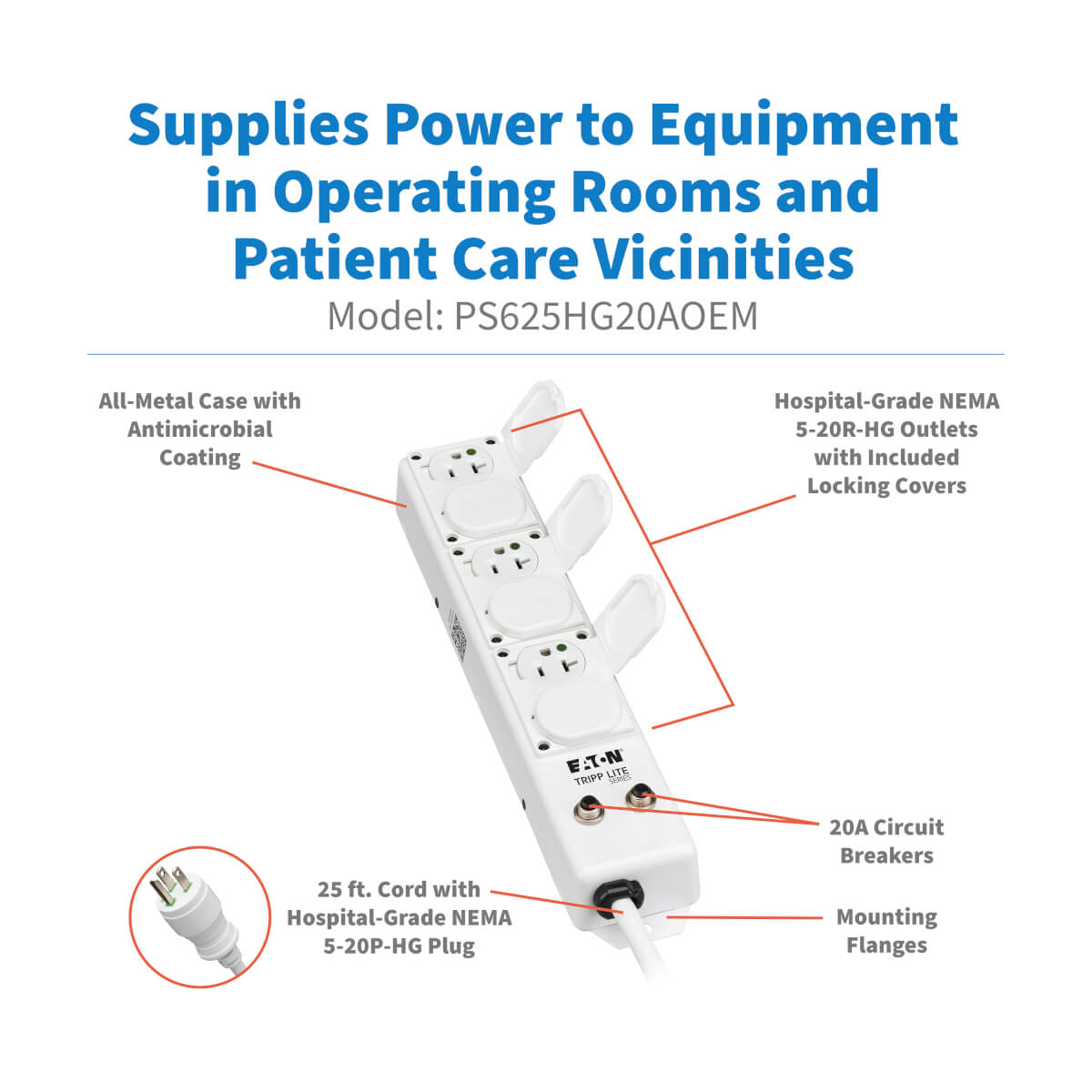 The PS625HG20AOEM Medical-Grade Power Strip supplies power to movable plug-connected components mounted to a rack, table or pedestal in operating rooms, patient-care areas, therapy rooms, imaging environments and administrative areas. Compliant with UL 1363A specifications, this 120V, 50/60 Hz power strip features a NEMA 5-20P-HG hospital-grade plug and six NEMA 5-20R-HG hospital-grade outlets. Two resettable built-in 20A circuit breakers control power to all outlets and protect the power strip against overloads. Switchless design prevents the unit from being accidentally shut off. Locking safety covers are integrated to protect unused outlets from debris and damage. Extra-long 25-foot 20A AC power cord gives you flexibility to roll the equipment where it’s most needed. Mounting tabs and flanges let you install the PS625HG20AOEM on a wide variety of surfaces, such as IV poles, mobile carts, crash carts and mobile medical workstations. All-metal housing ensures safety and is guaranteed to last a long time in demanding environments.
