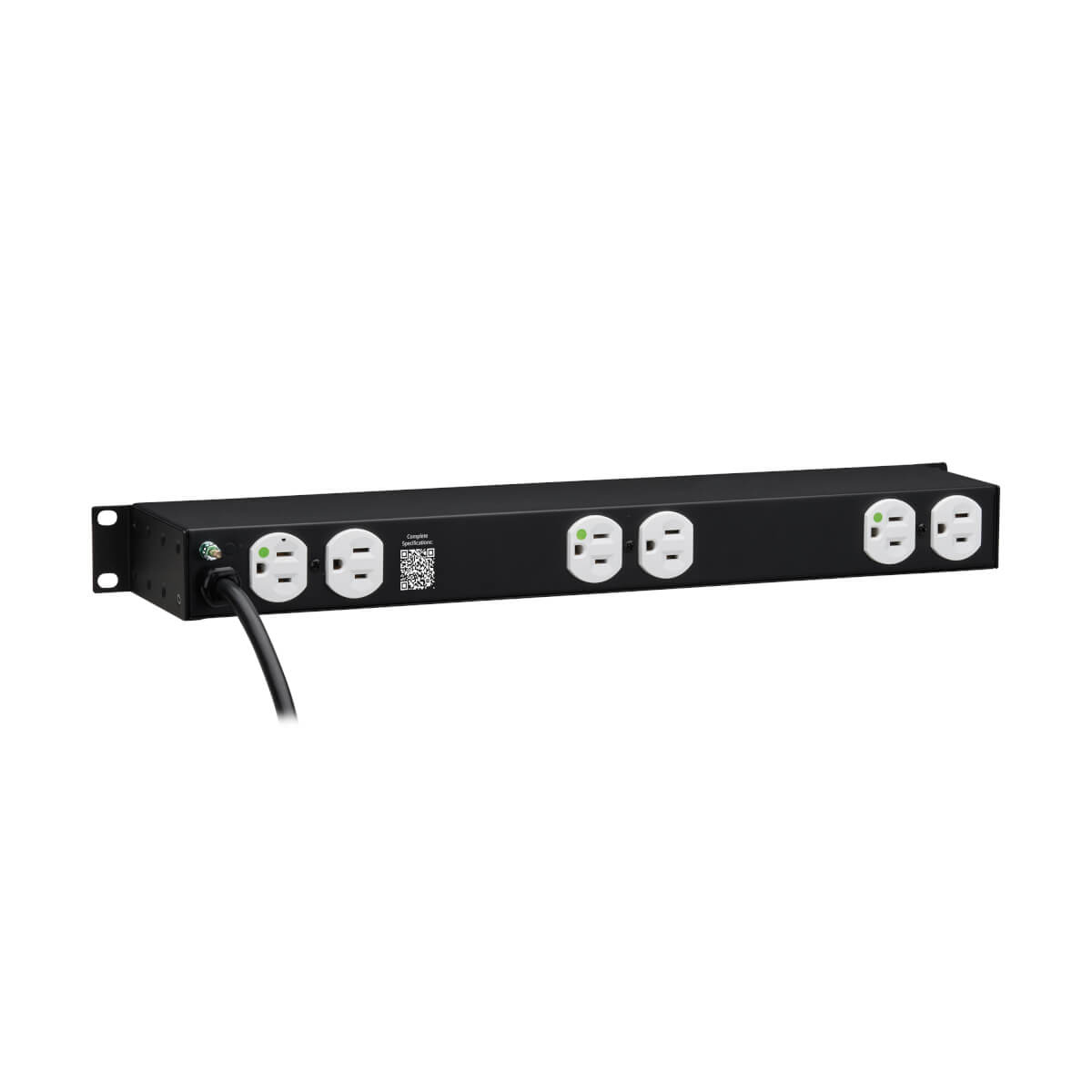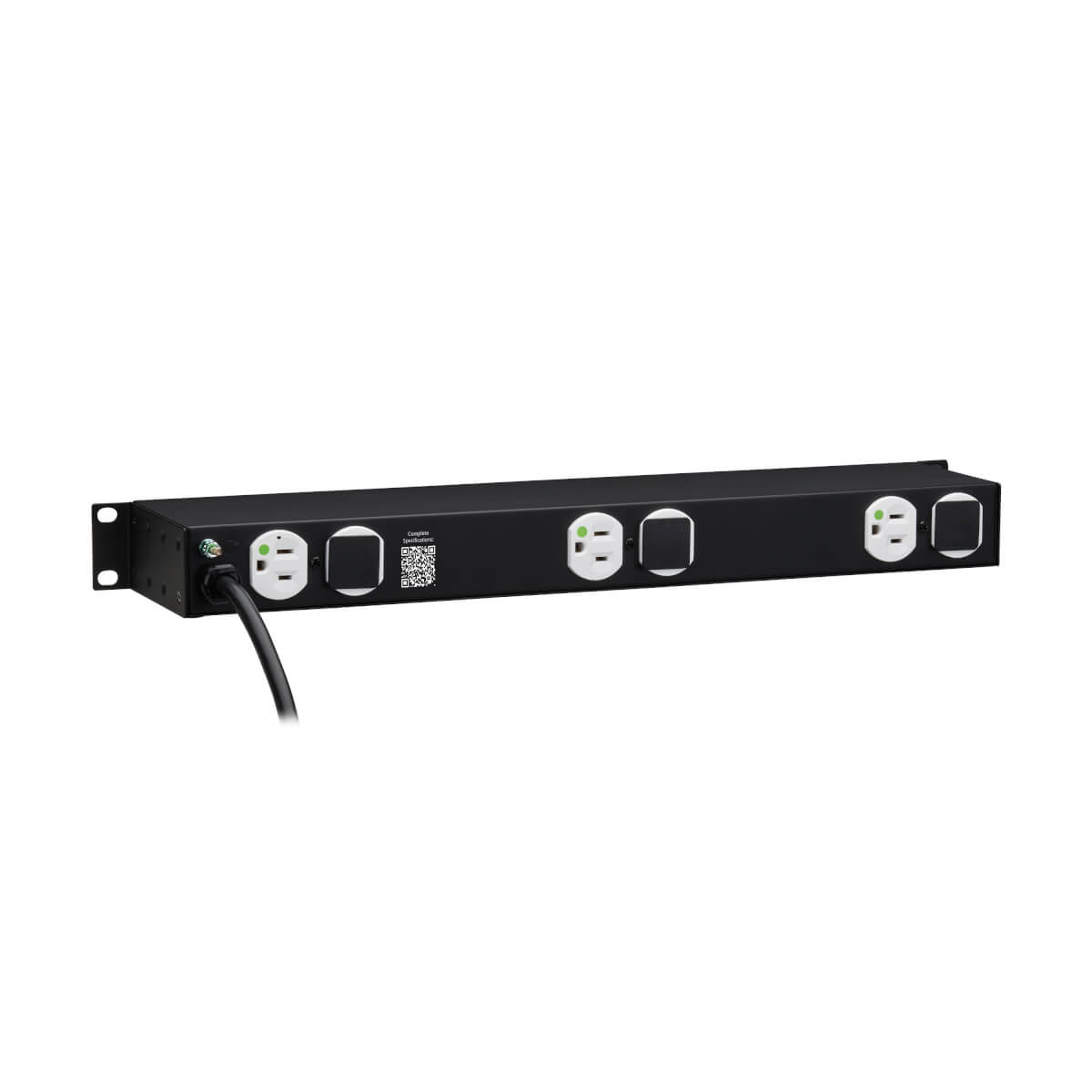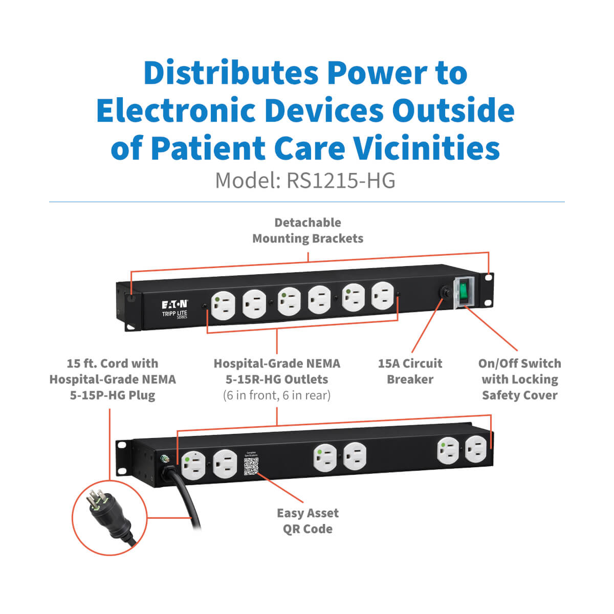 Tripp Lite's RS-1215-HG all-metal Power Strip offers 15A capacity AC power distribution in a versatile multi-mount cabinet. Detachable mounting flanges are configurable for rackmount, wallmount and under-counter installation. Uses only 1 rack space (1U) when installed in any 19-in. rack meeting EIA standards. Unfiltered electrical pass-through makes the RS-1215-HG ideal for distributing alternate waveform UPS or generator power in rack enclosures, network closets and more. Features Hospital Grade plug and outlets. Includes 12 outlets (6 front/6 rear), 15-ft. AC power cord and lighted switch with cover to prevent accidental turn-off.