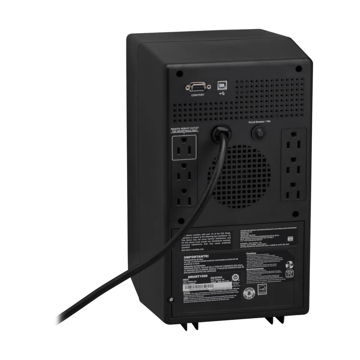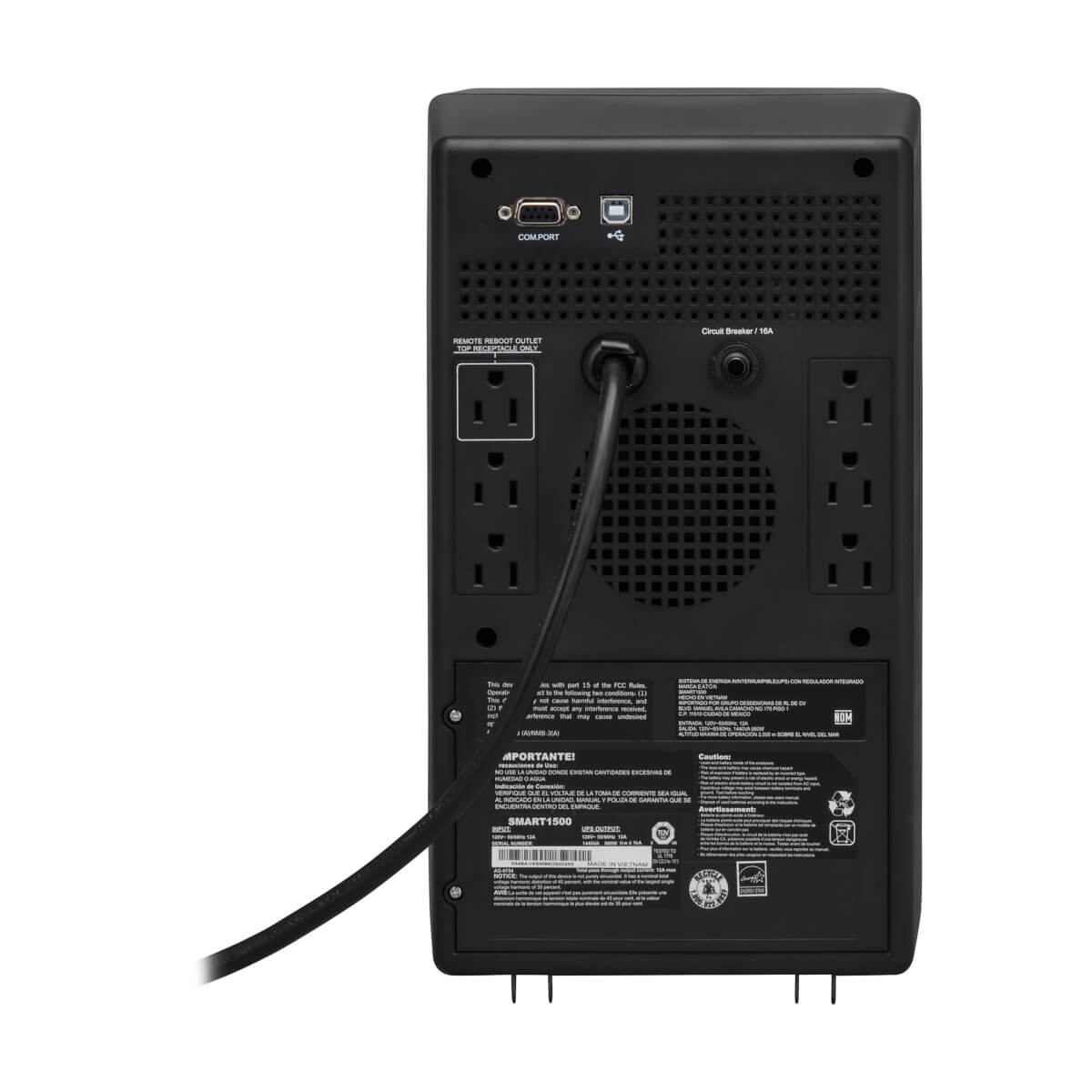 Tripp Lite's SMART1500 intelligent, line interactive UPS system protects servers, networking accessories and telecommunications equipment from blackouts, voltage fluctuations and transient surges. Large internal batteries offer 20 minutes half load runtime and 7 minutes at full load during power failures. 1500VA/980 watt power handling capability supports a variety of networking, telecom and various other application types, including the support of multiple network workstations. Includes a total of 6 outlets, 1 of which can be individually powered on and off via software interface to selectively reboot remote equipment or to automatically shed less significant loads to extend battery runtime for more critical equipment. Supports remote monitoring of UPS and site power conditions via built-in USB and DB9 monitoring ports. Includes PowerAlert UPS monitoring and unattended shutdown software with complete cabling. Built-in audible alarm and 5 front panel LEDs indicate status of line power, battery power, battery low/replace, voltage regulation and load level. Wall mountable with optional UPSWM wallmount bracket. Network-grade AC surge suppression protects equipment from damage and performance problems resulting from transient surges. Attractive, small-footprint tower housing uses less than 66 square inches of floor or desktop space.