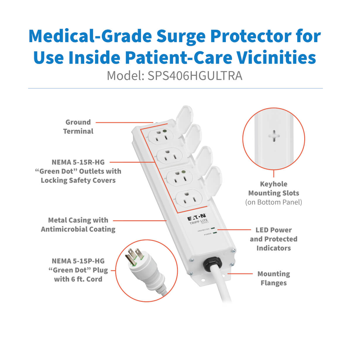 EATON, SAFE-IT UL 60601-1 MEDICAL-GRADE SURGE PROTECTOR FOR PATIENT-CARE VICINITY, 4X HOSPITAL-GRADE OUTLETS, 6 FT. CORD, ANTIMICROBIAL PROTECTION |