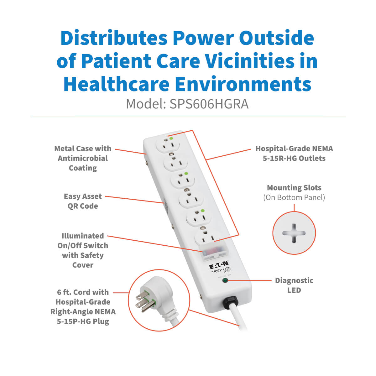 Our SPS606HGRA surge suppressor provides 6 hospital-grade outlets and protection from damaging surges and spikes with the added benefit of a convenient right-angle hospital-grade plug. The new design provides another option for convenient outlets outside the patient care area, including those tight spaces.