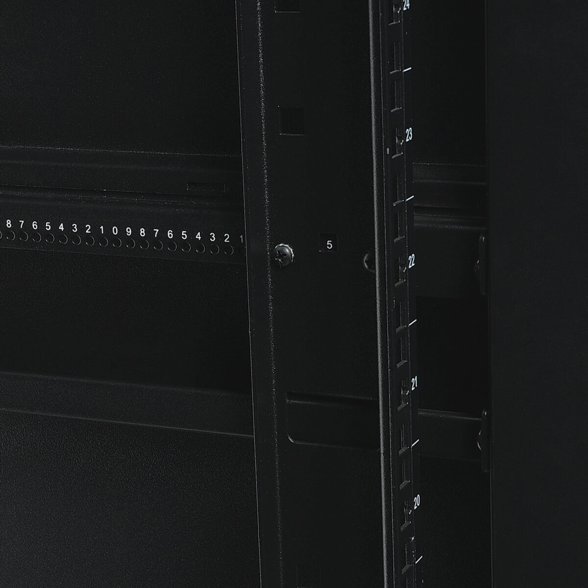 This 45U server rack comes fully assembled for quick and easy deployment with pre-installed casters that let you maneuver it over a level, smooth, stable surface and through a standard seven-foot doorway into position, where it can be stabilized by adjusting the levelers. Four mounting rails adjust in quarter-inch increments from four to 42 inches. Two rails also support toolless 0U mounting for quick installation of up to four compatible PDUs and vertical cable managers to help cut down on clutter.