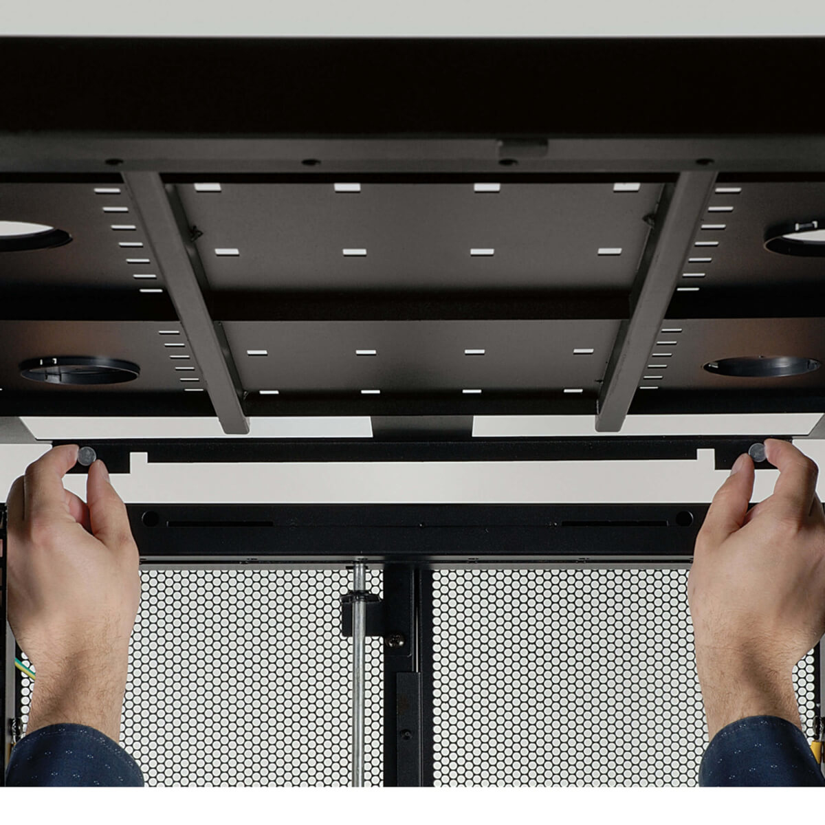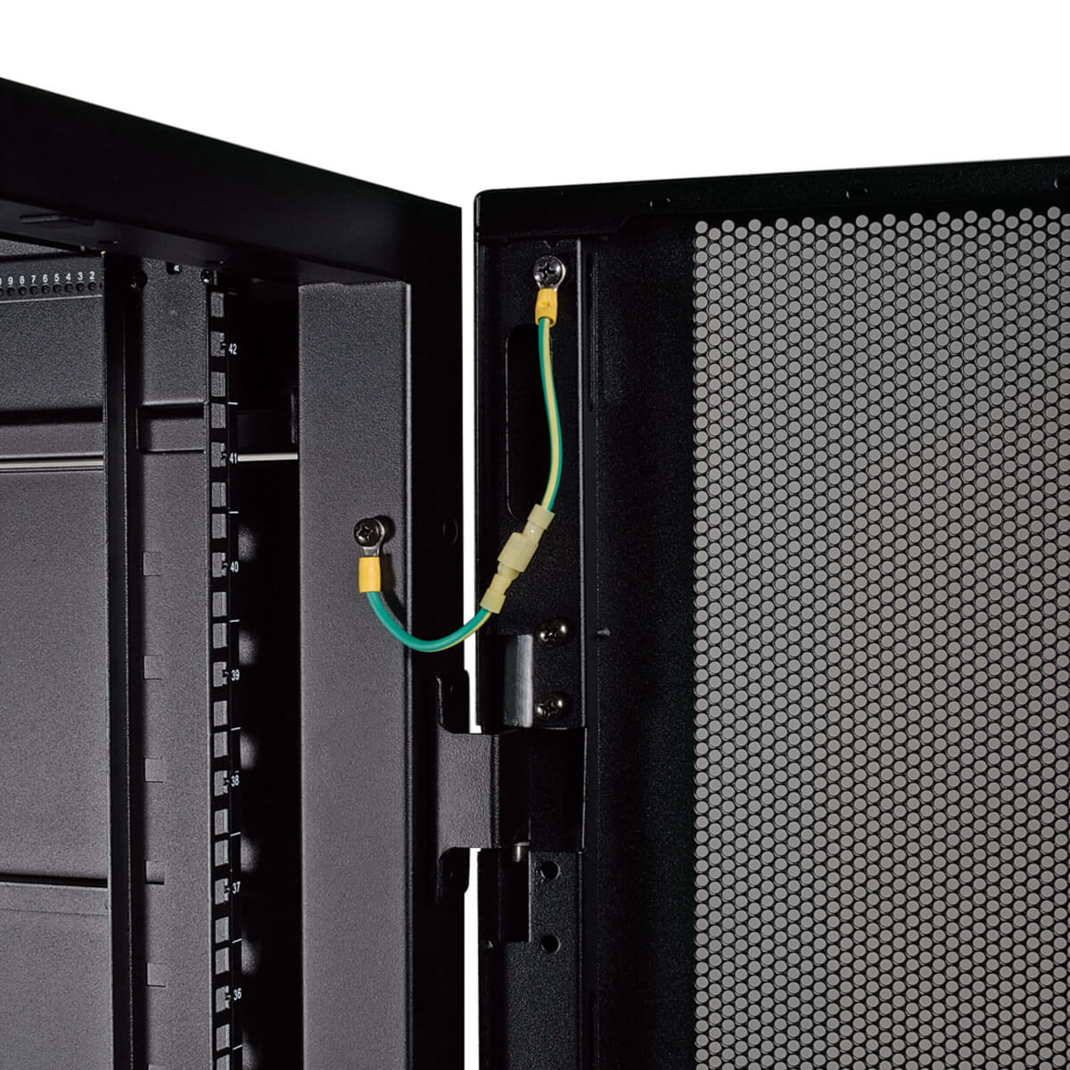 The reversible front door, split rear doors and half-size side panels lock securely to help prevent damage, tampering or theft. The doors, side panels and top panel are designed for quick release, making it easy to access connected equipment and cabling with little effort. Convenient top access ports and an open bottom allow easy cable routing through the cabinet. The vented doors allow generous airflow from front to rear to keep your equipment cool and functioning at its peak.