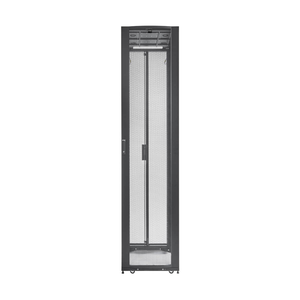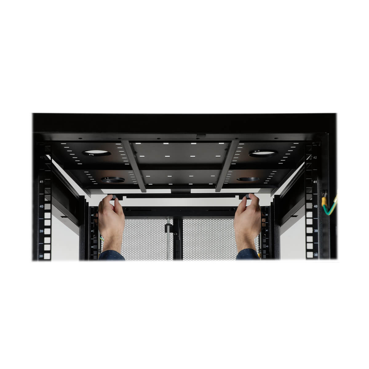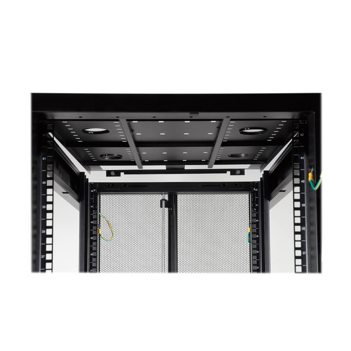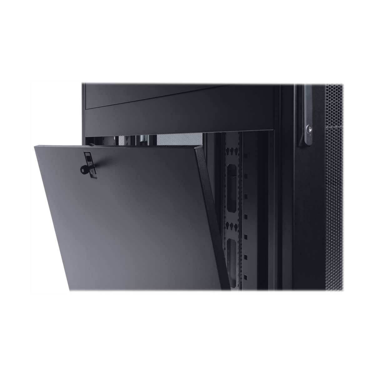 The reversible front door, split rear doors and half-size side panels lock securely to help prevent damage, tampering or theft. The doors, side panels and top panel are designed for quick release, making it easy to access connected equipment and cabling with little effort. Convenient top access ports and an open bottom allow easy cable routing through the cabinet. The vented doors allow generous airflow (more than 65% open space) from front to rear to keep your equipment cool and functioning at their peak.