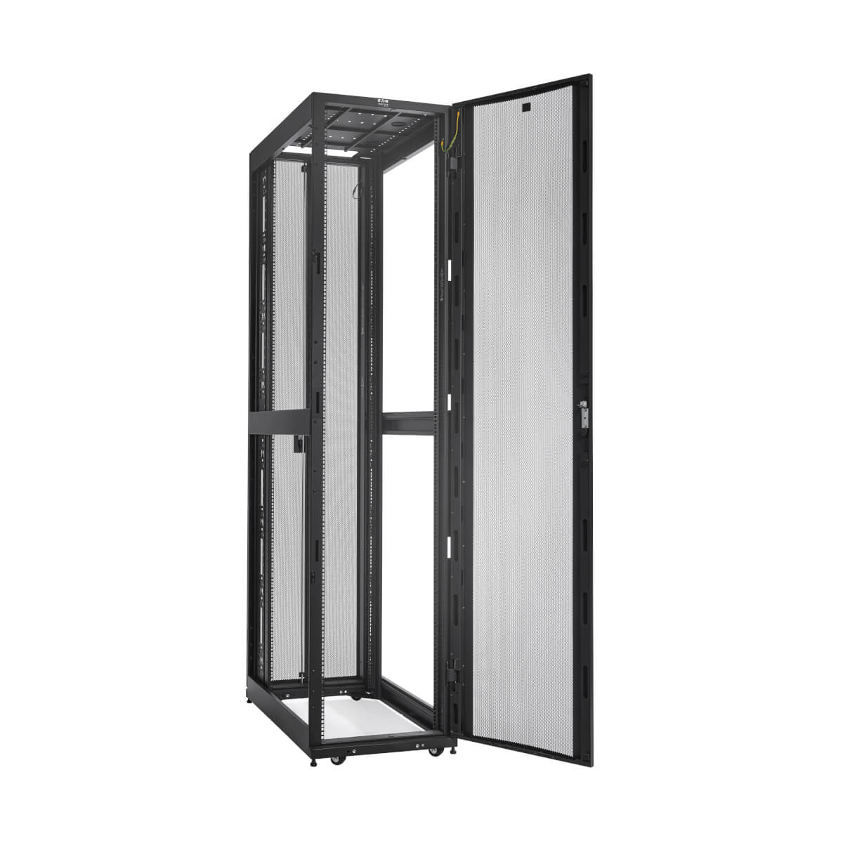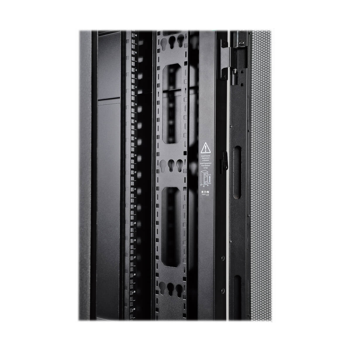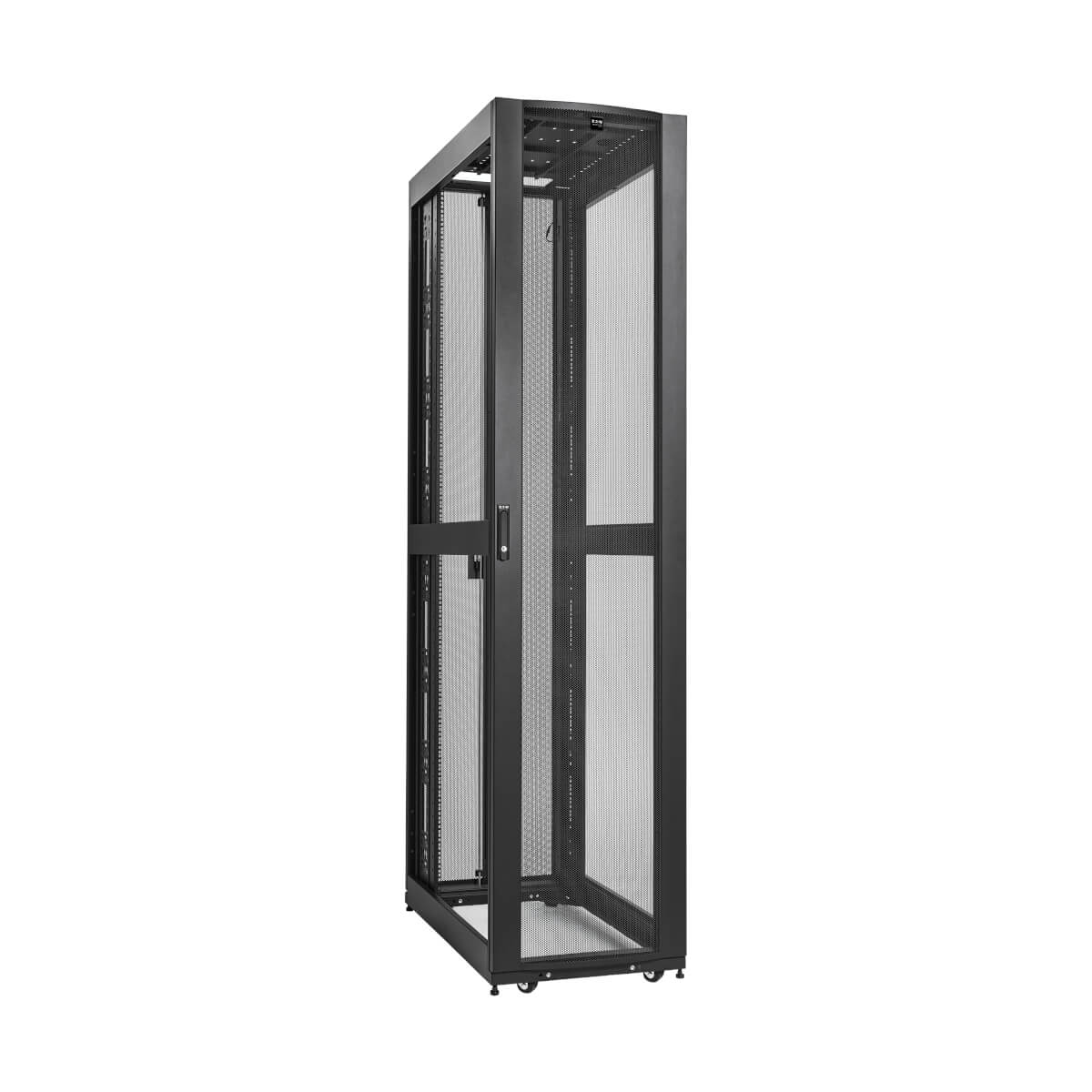This 50U server rack comes fully assembled for quick and easy deployment with pre-installed (and removable) casters that let you maneuver it over a level, smooth, stable surface and through a standard seven-foot (2.1-meter) doorway into position, where it can be stabilized by adjusting the levelers (also removable). Front and rear mounting rails accept standard rack equipment up to 37 inches (940 millimeters) deep. Toolless 0U mounting rails allow quick installation of up to four compatible PDUs and vertical cable managers.