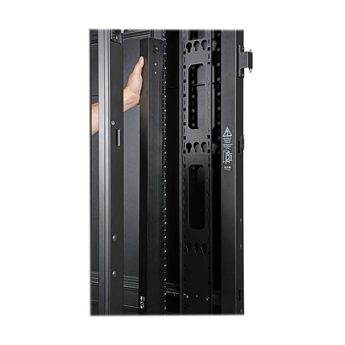 Built-in baying tabs allow the combination of two or more rack cabinets in a row. Center-to-center width can be set at 24 inches (600 millimeters) to match standard data center floor tiles.