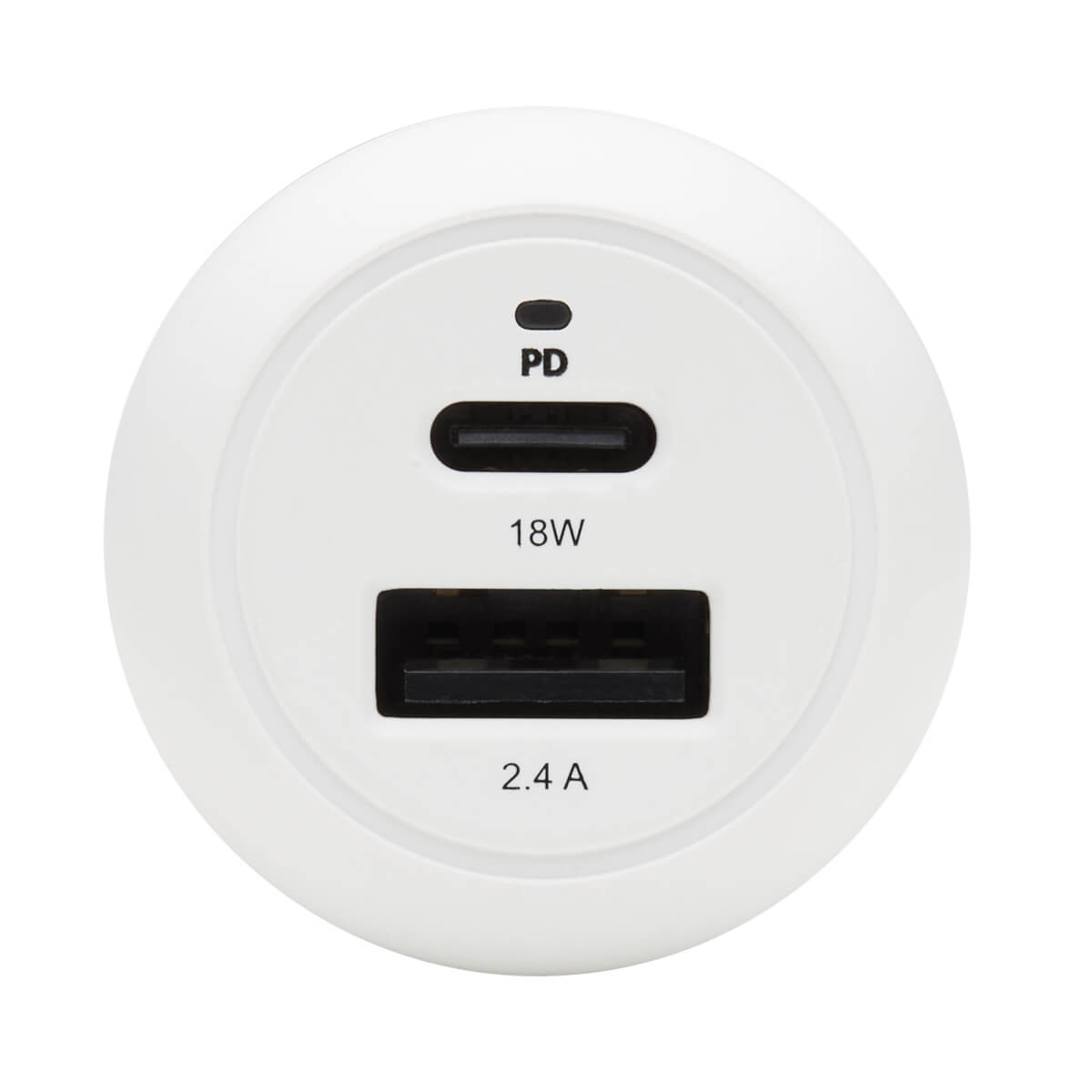 When used together, the USB-C and USB-A ports support up to 30W of charging power. The USB-C PD 3.0 port can support up to 18W (5V 3A or 9V 2A) to keep mobile devices at capacity. The USB-A port can support up to 12W (5V 2.4A) to reliably charge smartphones and tablets.