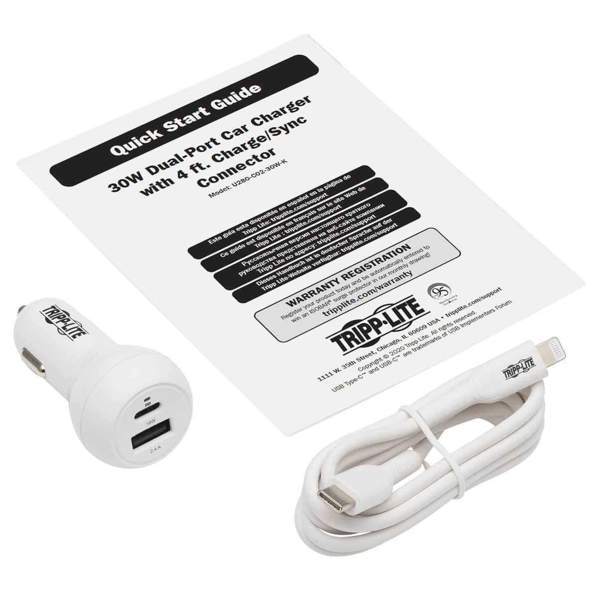The compact charger connects to any standard 12V DC vehicle power outlet, such as the one on your dashboard. Just plug it in and connect your devices’ USB cables (or the included USB-C to Lightning cable) for fast, convenient mobile charging. An easy-to-see green LED indicates the charger is receiving power. The U280-C02-30W-K is compatible with Apple (including iPhone), Android (including Samsung), Windows and Amazon devices with USB-A, USB-C or Thunderbolt 3 charging ports.