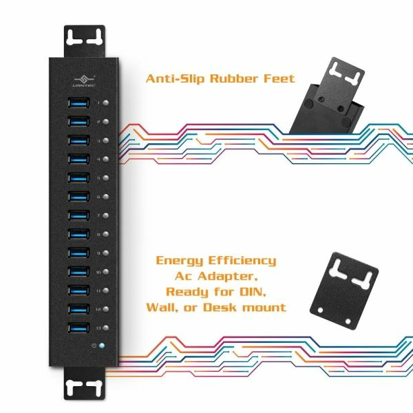 The Vantec Link 13-Port USB 3.0 Aluminum Hub is a simple and easy to use hub loaded with many features. This ergonomically designed Hub uses strong but light-weight machined aluminum casing for toughness. It can be placed on the office desk, mounted on the wall/desk (comes with mounting kit), or in a production setting in factory or rack using DIN mount. It is easy to connect and charge USB devices; consolidate them together in one convenient place on your workspace. All 13 SuperSpeed ports support Data/Charging BC 1.2 up to 1.5A designed for the fastest charging and still enables access to your data simultaneously. This Hub with its Certified Power Adapter gives you the ability to connect and load up the 13 ports to use a mix of low power and high Power devices. It also provides over voltage, over current and overheat protection. When not in use, this energy efficient power adapter sips very little power to save energy and when using with the latest OS, the USAP function further enhances the SuperSpeed USB capability. This Plug and Play hub will simplify, save time and help speed up data transfer between your devices.